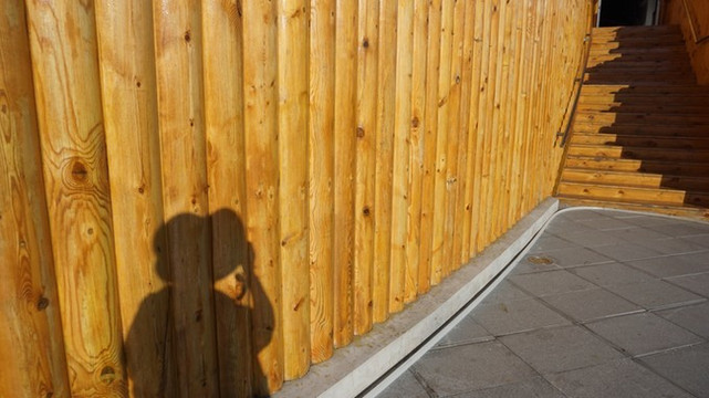 明黄色其实是木头色,只是阳光的照耀让它饱和度更高。门里门外没有一个游客。