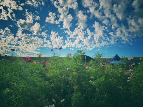 天上的云今天是花型的。我看到远处还有 蒙古 包形状的房间。于是决定和妈妈散个晨步。