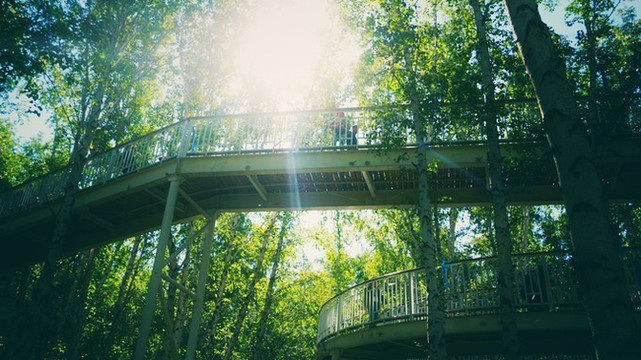 白桦林中有过街天桥一样的高空道。我们上去看了看,也没有看到什么更美的景色。但在白桦林中漫步身体和心灵是舒服的。土壤、树木、干净的空气无论多么平淡,都是和生命亲密无间的事物。