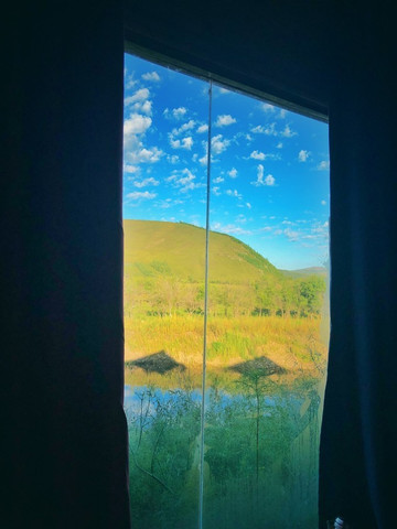 打开窗帘,发现我们的窗外是一片小小的池塘,在暮色中是漆黑的。听着太阳的余音,知道它第二天会在另一个方向与我们重新见面的。晚安。