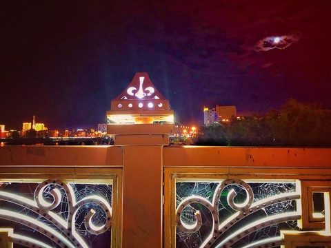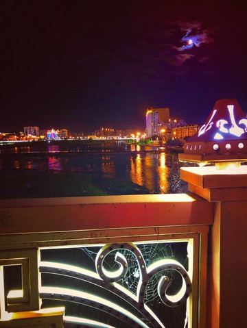 穿过另一座大桥回到我们酒店的那一岸。五光十色的河水和城、幽兰绯红的月亮露出来。射灯照亮了桥栏杆上所有的蜘蛛网。