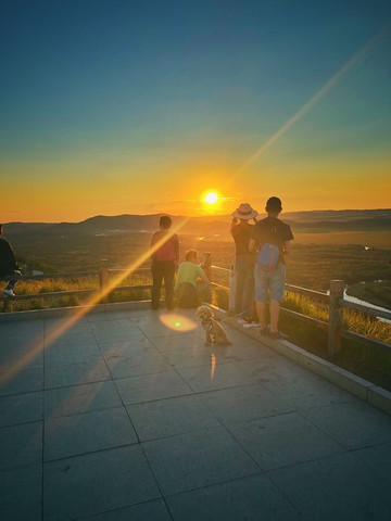 我们也耐心地等待太阳落下。等待过程中我有点惊讶,本来离地平线上的山还有一小段距离,瞬间就沾上边了。原来太阳竟然走得非常快。这句话当然不准确了,太阳是固定守恒的,是地球在奔跑。是我们自己在奔跑,自己的时间和生命在奔跑。不易察觉的白驹过隙。