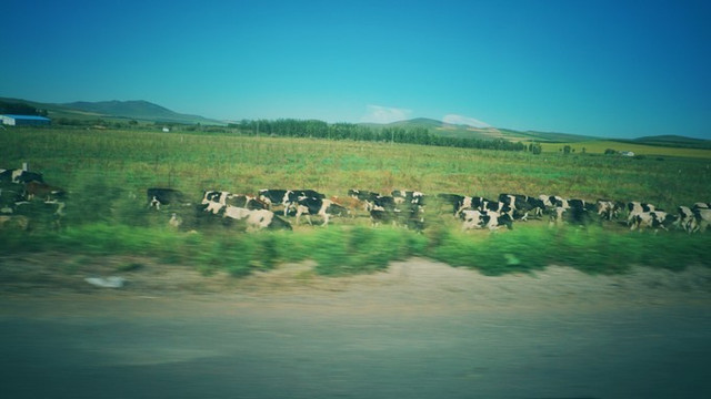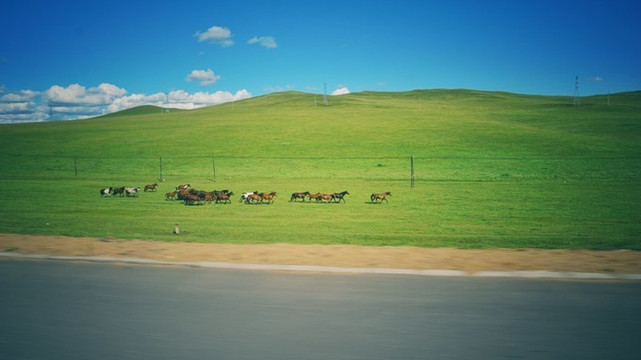 但内心宁静抱怨了一小会儿,车子就开上了柏油公路了。沿途是丰美的草场。我看到全身赤裸的马群不知道商量着要去哪里。