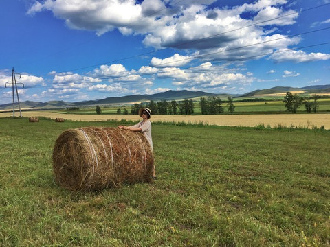 在 塞尔维亚 的草原就见过这种大草卷。来时的一路上也看到无数的大草卷躺在 呼伦贝尔 的无际草原中。草卷是牧民在秋天时收割的荒草。可能夏天的时候也割了,一茬儿又一茬儿。他们是给过冬的牲畜做食物的。我下了车,走到大草卷边上。很吃力地想爬上去,无奈它太大了,而且它是湿的。