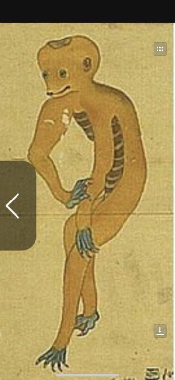 后来,这件事一直在我心里萦绕不去,晚上回到酒店。我查了河童这个东西,找到了这张高度相似的河童的画像。同样的鼠般的样貌、同样圆黑的萌眼睛。资料上说:河童,是神话中的生物。有鸟的喙,青蛙的四肢,猴子的身体及乌龟的壳。传说其弱点为头顶的碟,只要诱骗河童弯身,让他头顶碟子里装的水流尽,他就会精力尽失。这是传说的部分,还有人分析为什么会有河童这个神奇生物的形象出现。其实他这种模样是从十六世纪到 日本 传教的 葡萄牙 传教士到发型来的。当时不少的东方人都以为这些传教士是从海的另一边坐船而来的水神。