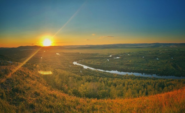 平淡的 额尔古纳 湿地,因为落日余晖的关系而变得色彩非常丰富,太阳变成金红,大地里仔细分辨能把色轮中的颜色都找出来。还有暗影中蓝紫色的渐变。