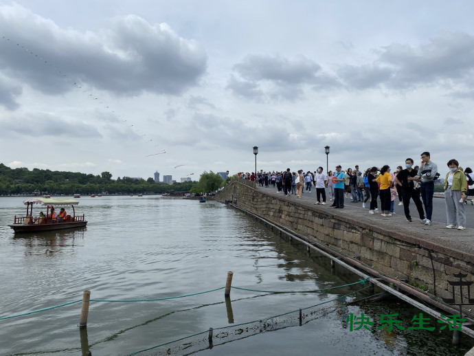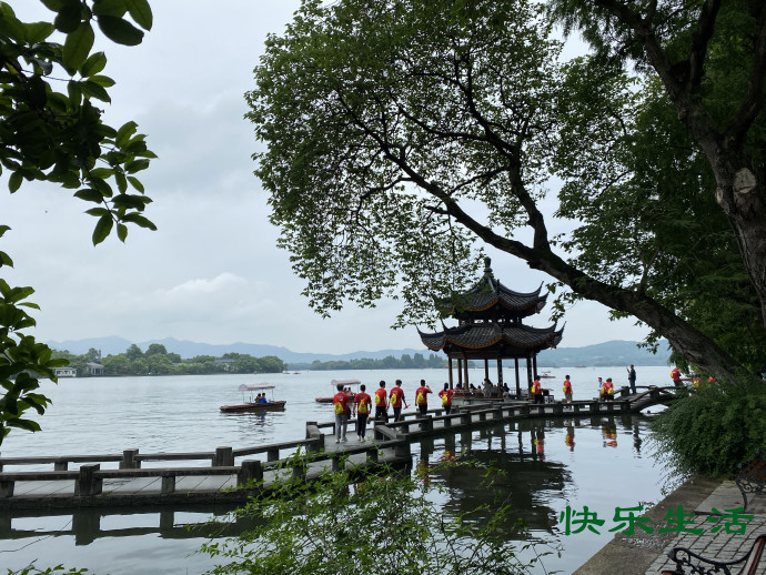 西湖有很多穿着统一衣服的年轻人,估计是各单位搞的团建活动。年轻真好!