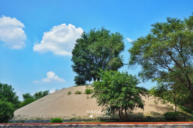 走上城墙,可以绕到 方城 最北,便能看到清昭陵的宝顶,上有一棵树。
