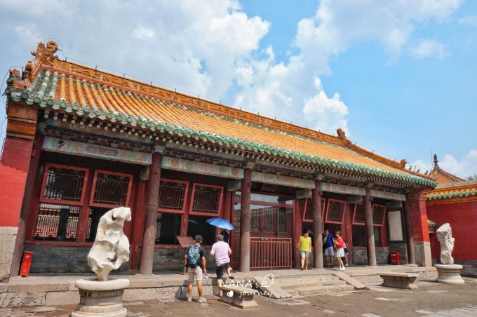 故宫东路便是最早的大政殿和十王亭,大政殿又名八角殿,八角重檐亭式,下为须弥座台基,殿顶黄琉璃瓦和镶绿剪边,殿前柱上各有金龙盘柱,殿内有梵文天花。