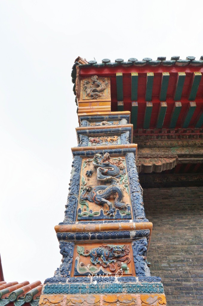 沈阳 故宫的建筑细节,细细品来,用色五彩斑斓,符合满族喜爱色彩鲜艳的审美风格。各种琉璃配件、龙、麒麟、羊、狮、海马和瑞草奇花等雕刻图案,都是艺术瑰宝,值得反复品味欣赏。