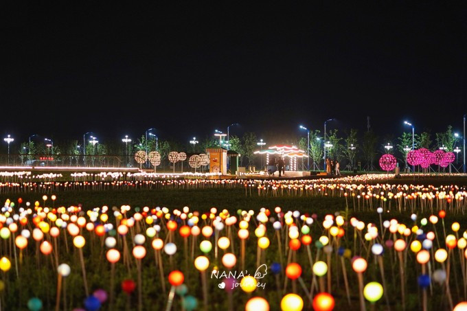星光花海泛着五彩斑斓的 光泽 ,虚虚实实,我们顺着星光的指引,开始了一场夜的梦幻之旅。花海一共有好几片区, 比如 金色麦田,五彩星球,还有……最让我们惊讶的……