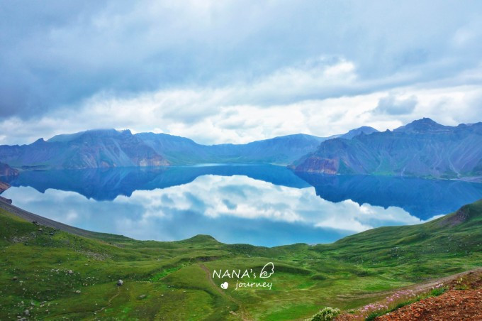 “哇,真的是如镜一般!”我激动地欣赏着近在面前的天池。夏季葱绿的高山草甸,未着色却清澈透着湖上世界的天池水,还有若隐若现随风飘荡的野花,天池的神秘终于被我一眼望尽。
