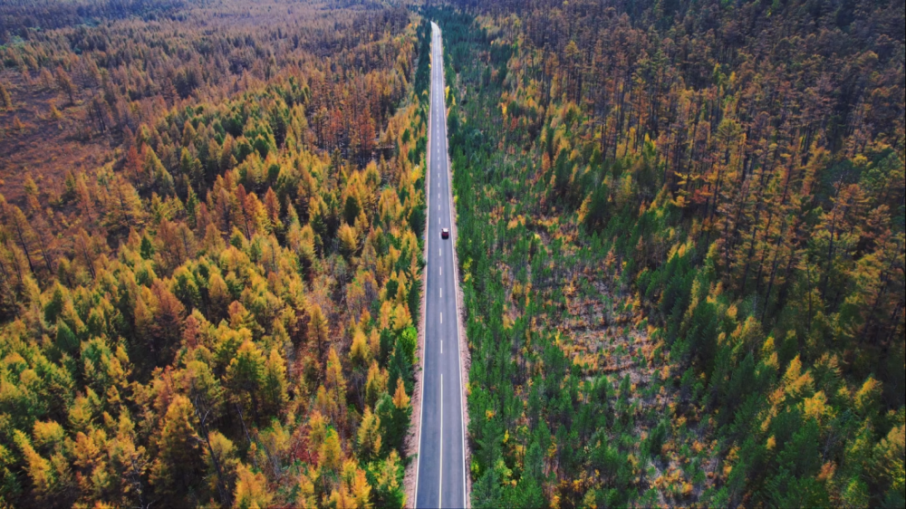 进入深秋,这片绝大部分是樟子松的原始森林开始变幻它的色彩。目光所及都是层林尽染的彩林和连绵起伏的远山,仿佛闯入仙境。秋意浓时,金黄落叶如雨般纷纷飘落,太适合被收录进秋日的回忆中了。
