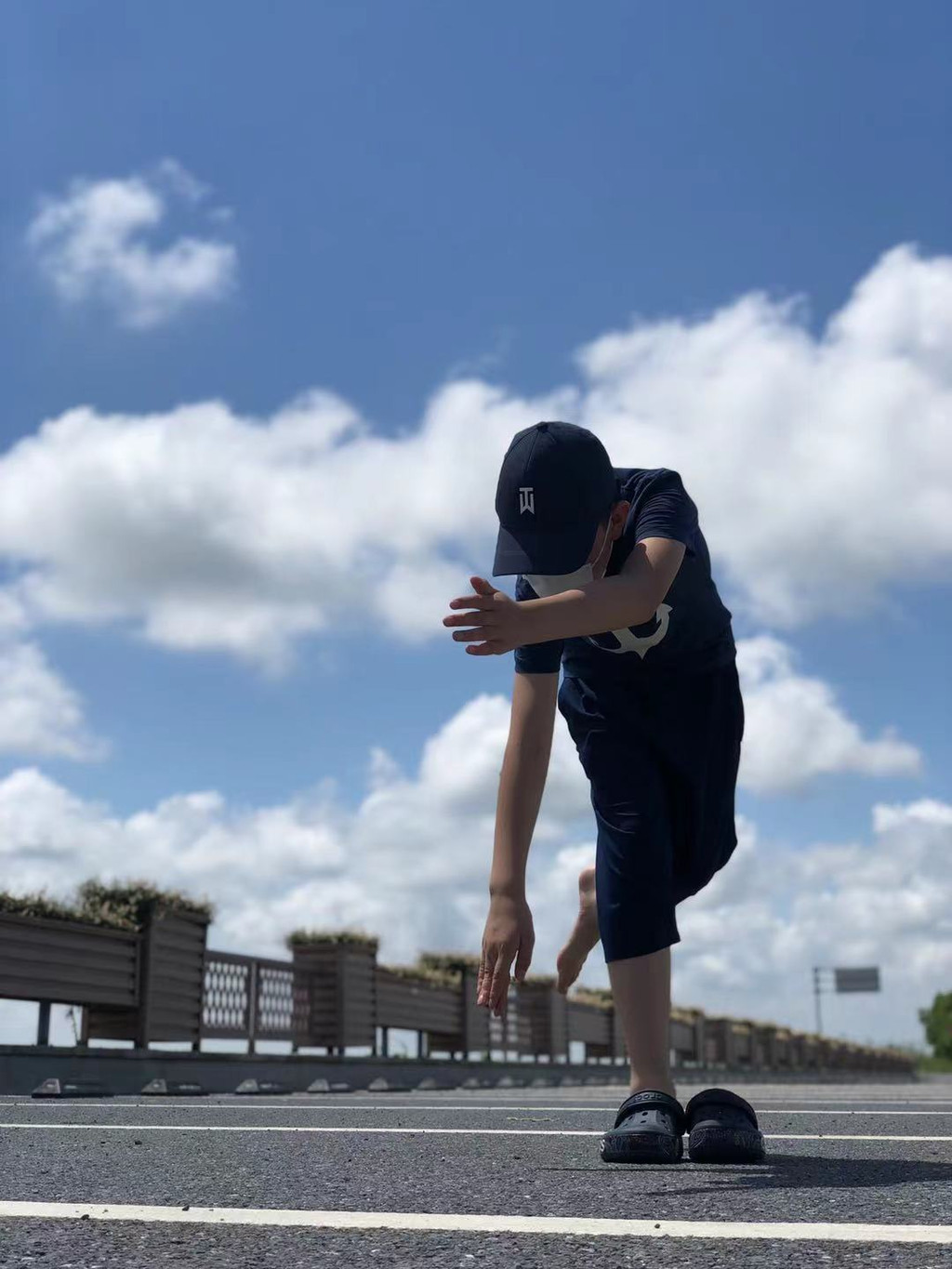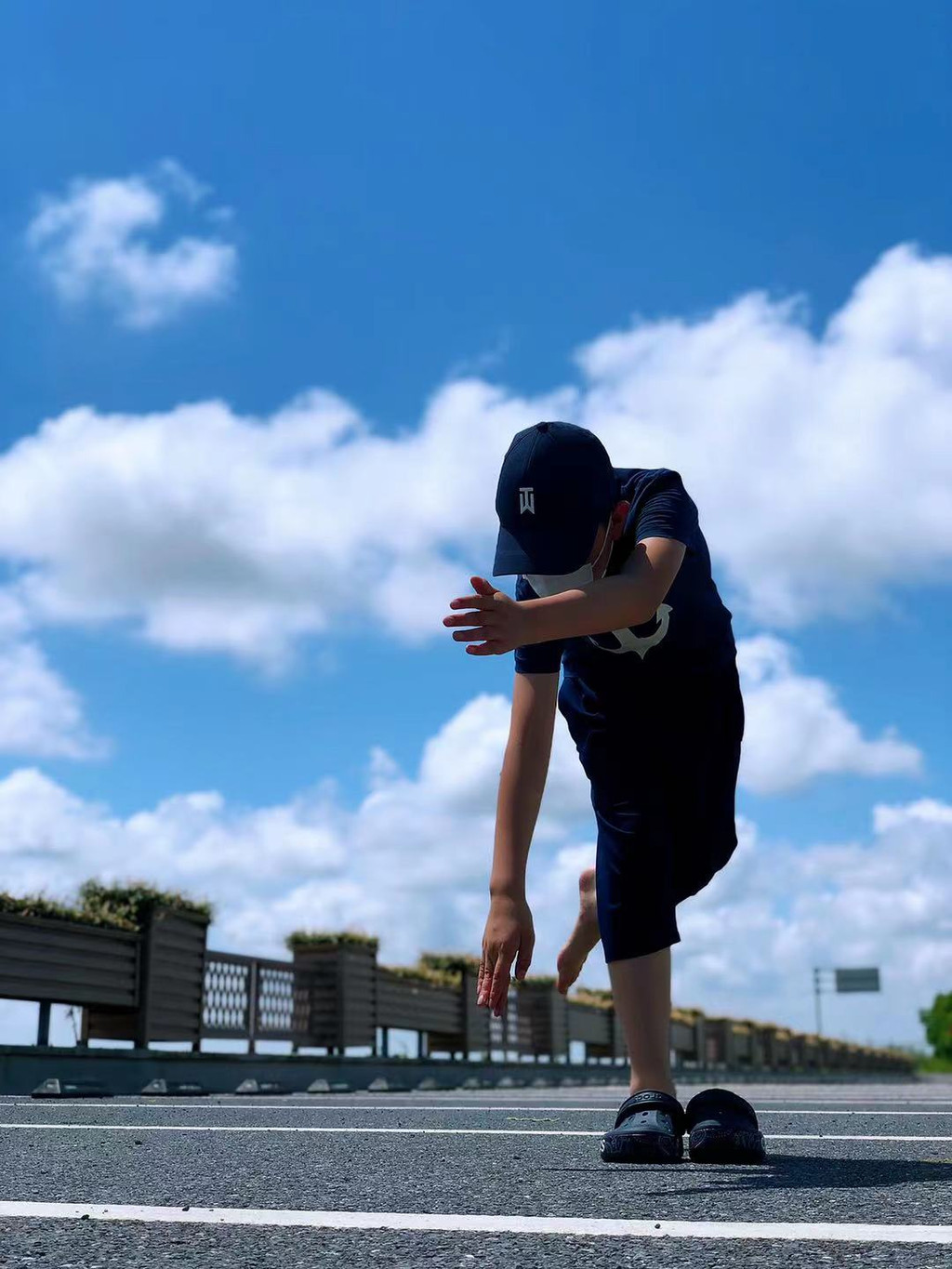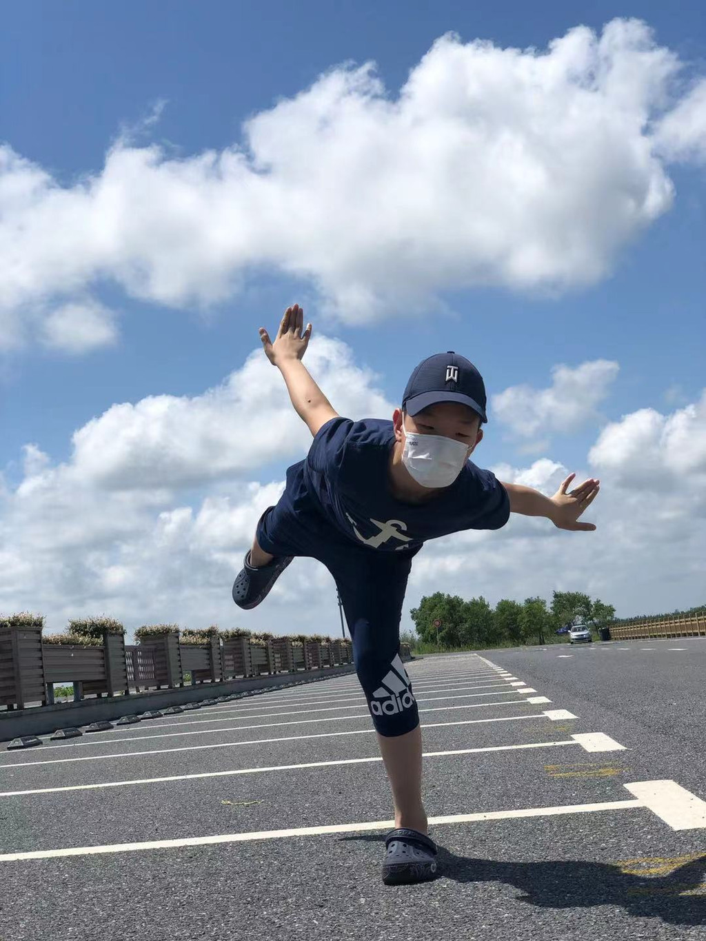 在门口停车场给小宝拍照,有没有一种在国外拍大片的感觉,天蓝云白,人少景美,pose随便摆