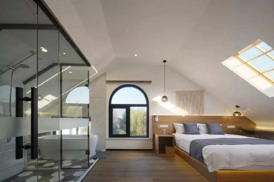民宿地势优越,周边竹林绿水环绕,环境清幽宁静。民宿主人想法独具匠心,通过对原有建筑进行设计改造,打造出了这样一家极具上海特色的乡野轻奢度假民宿。