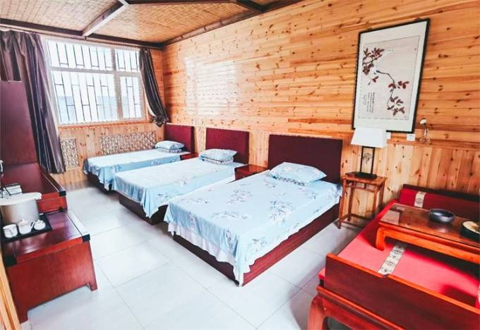 房间设施:客房共计10间,标间一个,豪华套房一套,大床房3间,三人间3间,25个床位,适合朋友、家庭、公司团建、宴请重要客人、领导,卧室的空间很大,具有传统木质的桌椅,而空间极大,红木家具衍生出一派文人气韵的生活格调,为宾客打造别具一格的入住体验。客房内以现代简约与传统中式为主的装潢,配上原木色木板,让房间内部更显温馨舒适。