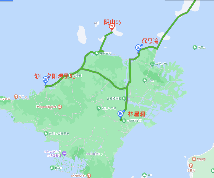 路线四(暑假太热) :苏州西山: 沉思湾 → 阴山岛 → 林屋洞 → 静山夕阳观景处 (一天结束)