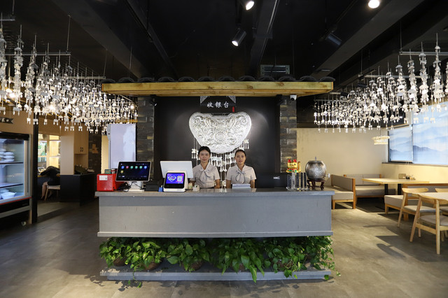 餐厅的位置可以说是占尽天时地利,旁边还有 #瑞银鸟纯银手工(甲秀店) ,对于客人们体验贵州的民族文化、买银饰手信带回去也很方便~餐厅里处处布置有银饰器具,灯罩也是苗族的头饰,这个比较有特色!