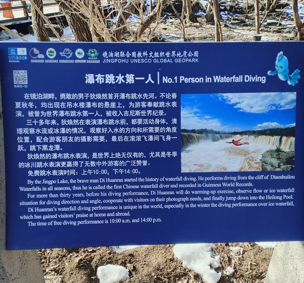 1983年6月17日,24岁的狄焕然在吊水楼瀑布顶上,第一次跃进黑龙潭,开始了他悬崖跳水生涯。之后,不管晴天雨天,也不管春夏秋冬,每天两场吊水楼瀑布跳水表演,他都全力以赴。2008年,狄焕然被吉尼斯世界纪录认定为“世界悬崖跳水第一人”。时光飞逝,眨眼间就来到了2025年,狄焕然从一个东北小伙跳成了一位东北大爷!到了冬天,吊水楼瀑布已变成冰棱满布的冰川,他依然每天两次站在冰川顶上,一如既往地飞身一跃,飞进黑龙潭,飞进广大游客的镜头里,飞进网络世界的视频里,引来一片赞叹,也引来更多的游客来到镜泊湖!