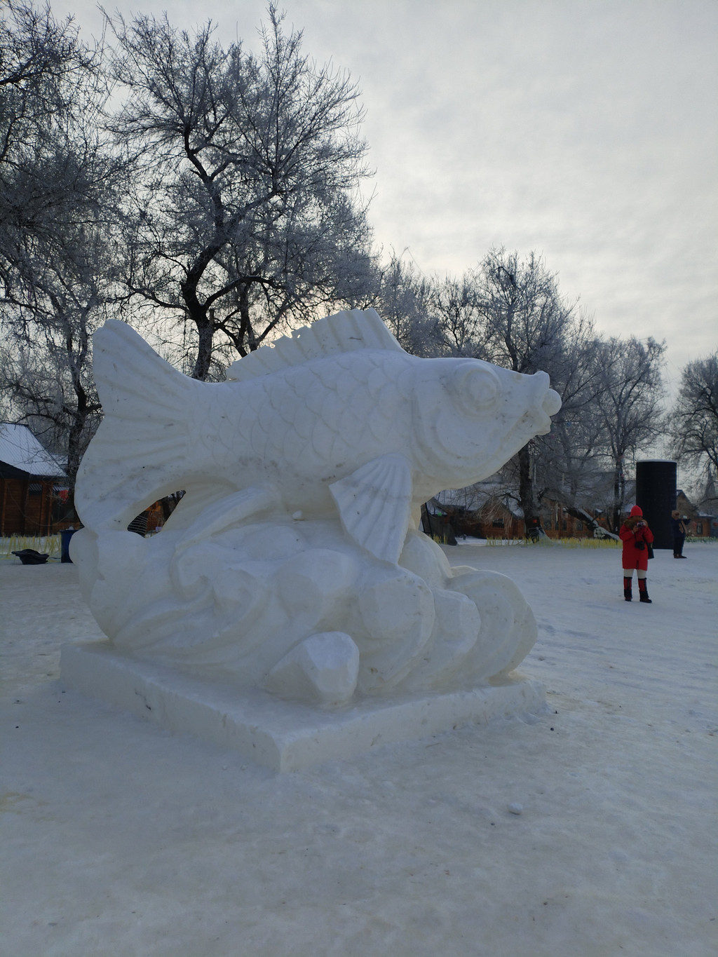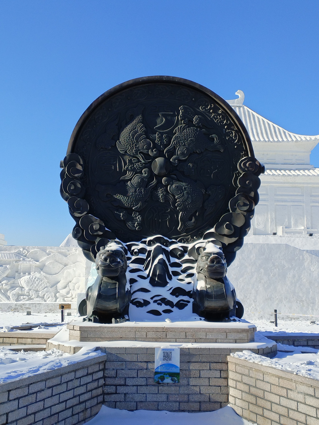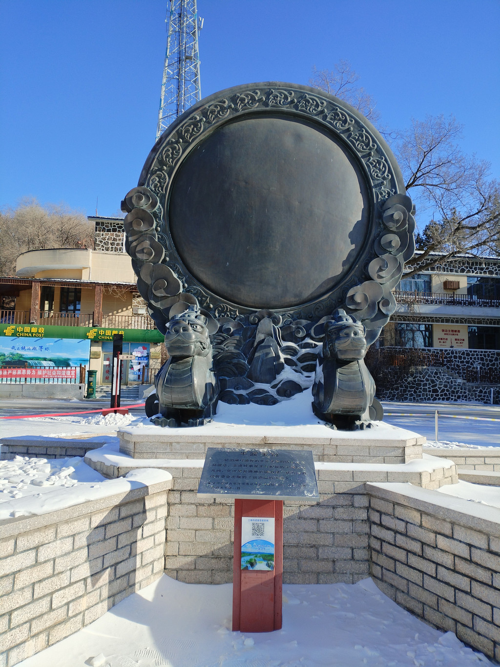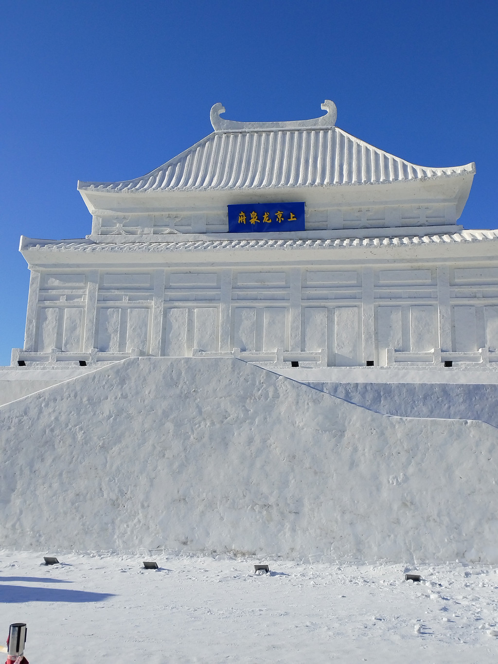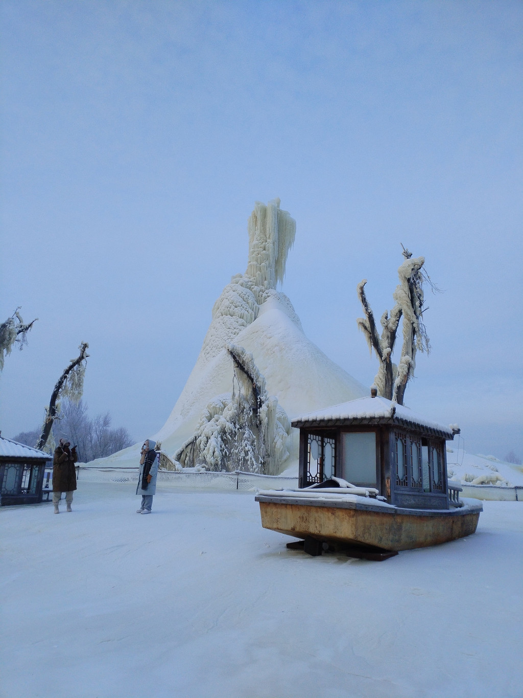 镜泊湖在黑龙江省牡丹江宁安市,是远古火山爆发所喷出的熔岩堰塞牡丹江而形成,它是我国最大的火山熔岩堰塞湖。当我们乘坐景区交通车来到镜泊湖边时,呈现在我们眼前的不是浩渺的湖水,而是一个超级大的冰场。冰场上停有一艘镜泊湖号轮船,还有一些游乐设施。镜泊湖的冰层很厚,走在上面根本看不到冰下面的湖水——工作人员用电钻在冰上钻洞,然后插上旗杆,也不见湖水涌出。湖边有一座大型雪雕《上京龙泉府》,气势恢宏,让人为之瞩目——唐朝时,这里属于渤海国,渤海国首府就在宁安,叫上京龙泉府。
