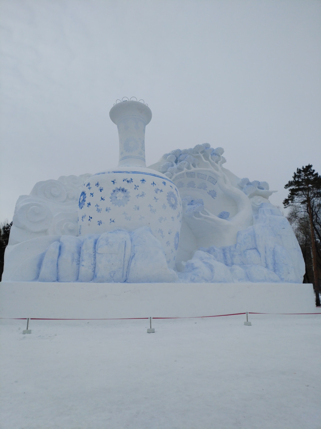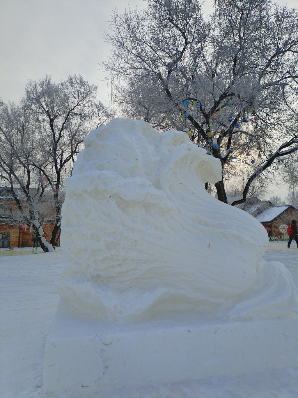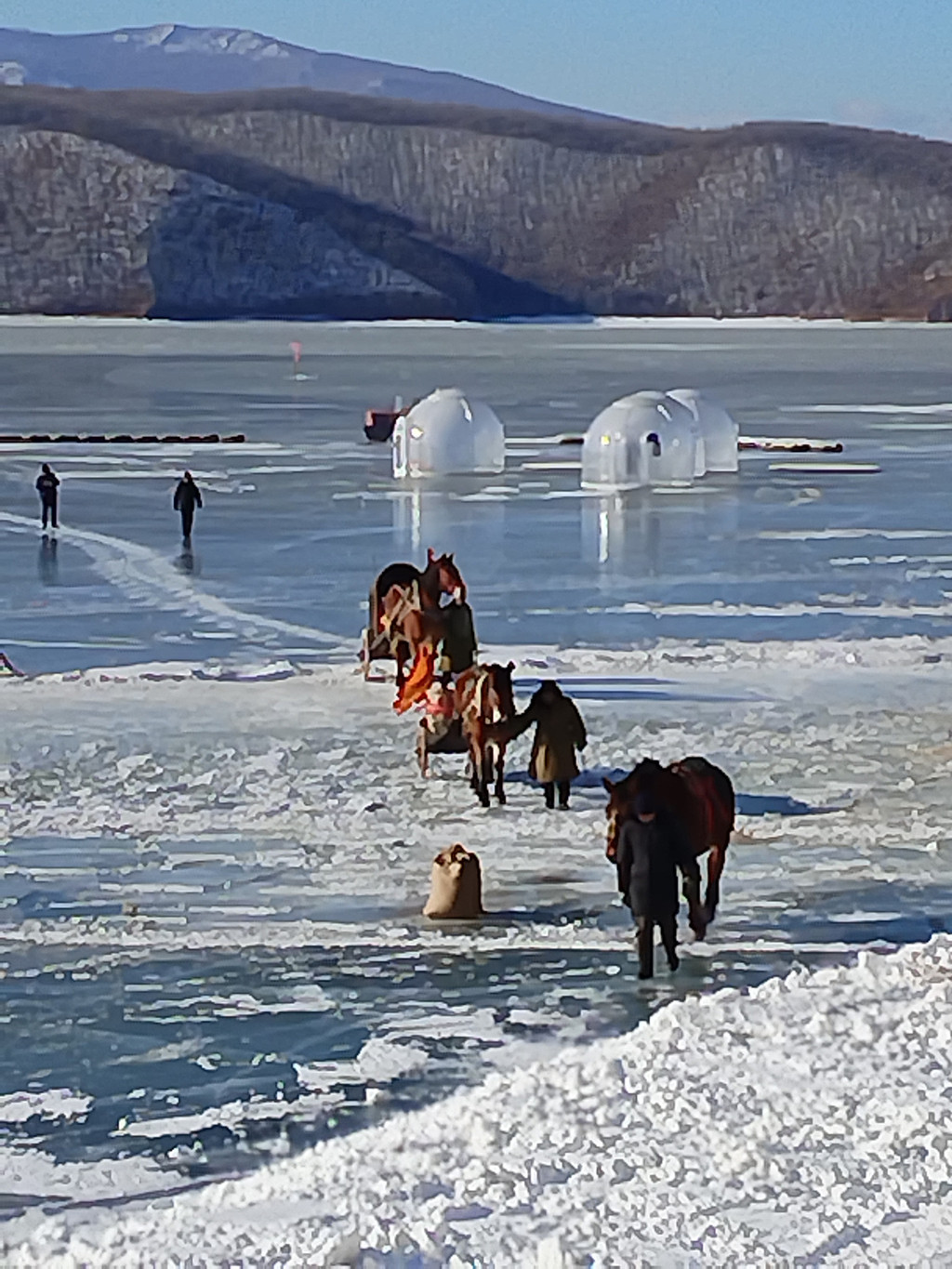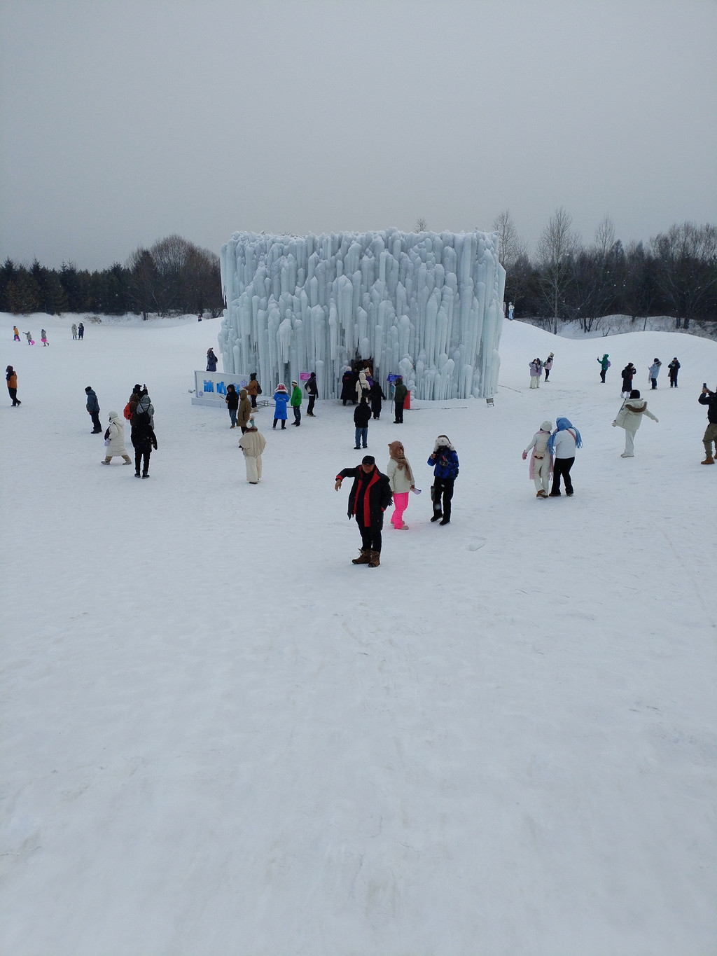 镜泊湖在黑龙江省牡丹江宁安市,是远古火山爆发所喷出的熔岩堰塞牡丹江而形成,它是我国最大的火山熔岩堰塞湖。当我们乘坐景区交通车来到镜泊湖边时,呈现在我们眼前的不是浩渺的湖水,而是一个超级大的冰场。冰场上停有一艘镜泊湖号轮船,还有一些游乐设施。镜泊湖的冰层很厚,走在上面根本看不到冰下面的湖水——工作人员用电钻在冰上钻洞,然后插上旗杆,也不见湖水涌出。湖边有一座大型雪雕《上京龙泉府》,气势恢宏,让人为之瞩目——唐朝时,这里属于渤海国,渤海国首府就在宁安,叫上京龙泉府。