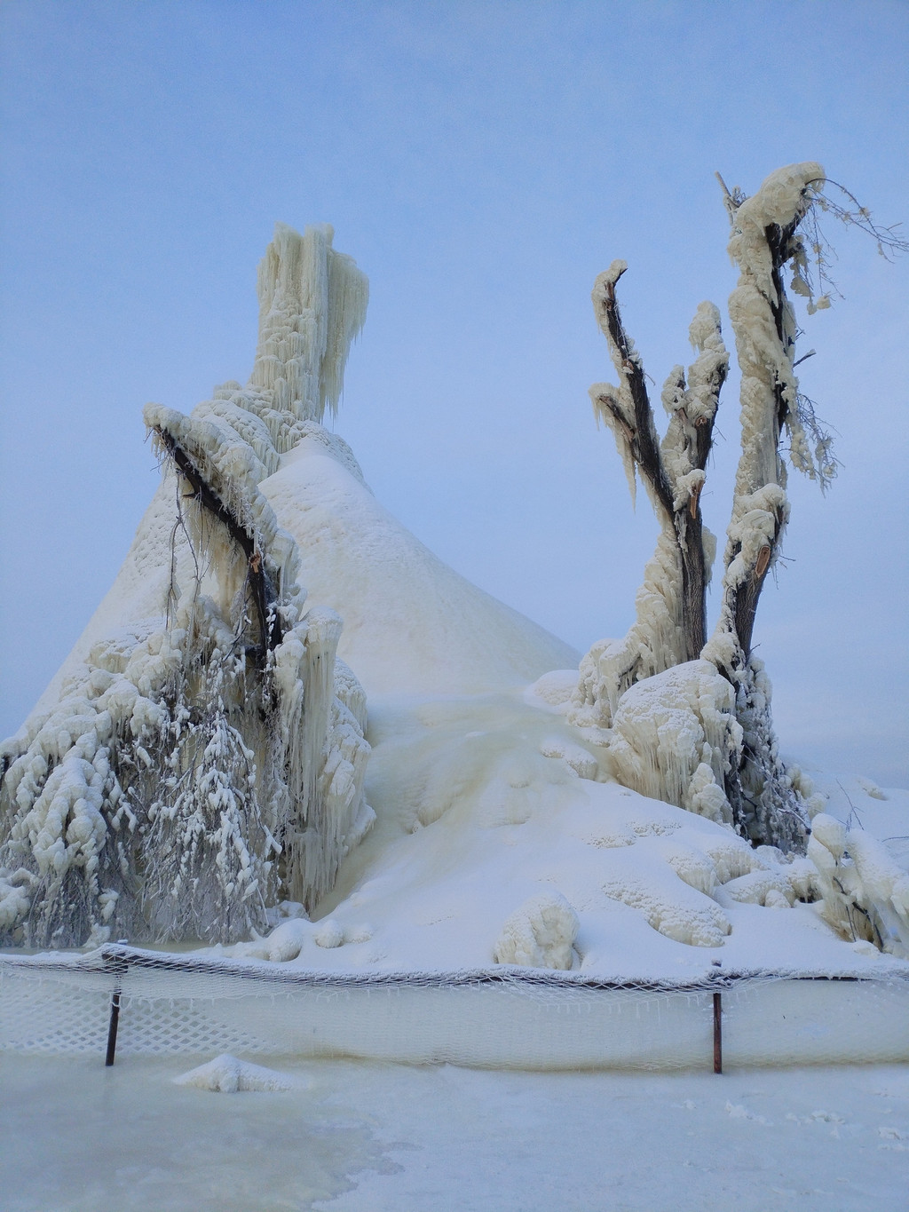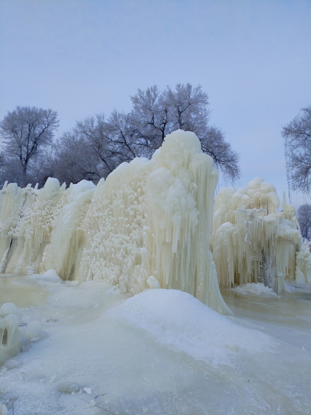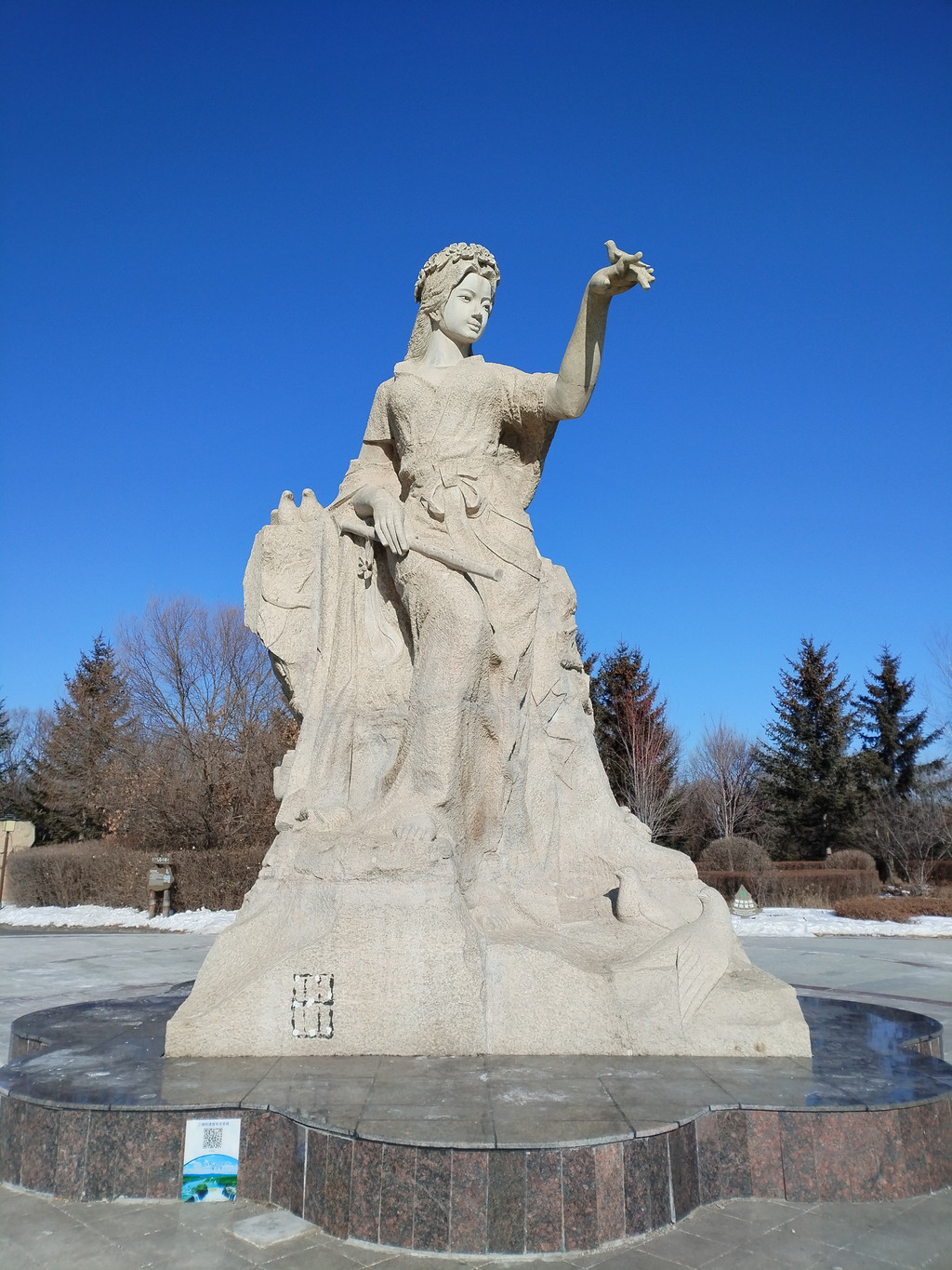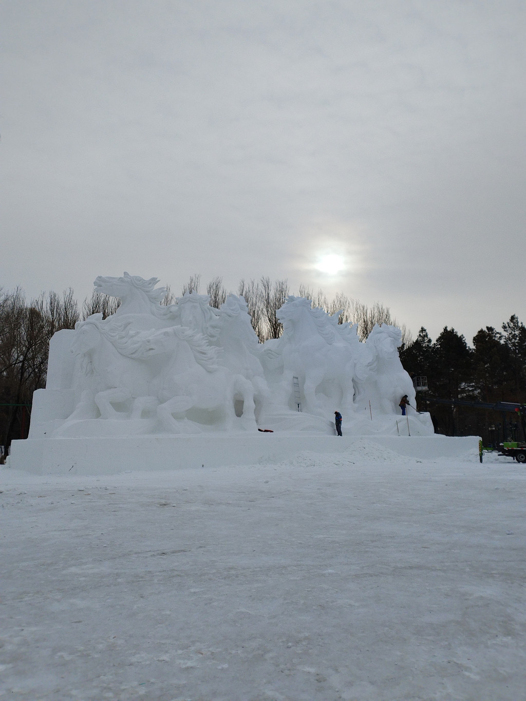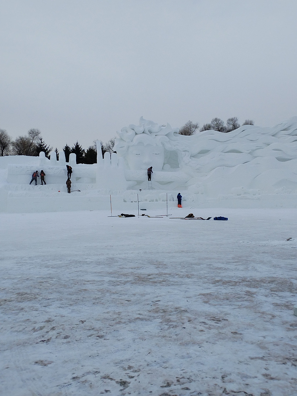 镜泊湖在黑龙江省牡丹江宁安市,是远古火山爆发所喷出的熔岩堰塞牡丹江而形成,它是我国最大的火山熔岩堰塞湖。当我们乘坐景区交通车来到镜泊湖边时,呈现在我们眼前的不是浩渺的湖水,而是一个超级大的冰场。冰场上停有一艘镜泊湖号轮船,还有一些游乐设施。镜泊湖的冰层很厚,走在上面根本看不到冰下面的湖水——工作人员用电钻在冰上钻洞,然后插上旗杆,也不见湖水涌出。湖边有一座大型雪雕《上京龙泉府》,气势恢宏,让人为之瞩目——唐朝时,这里属于渤海国,渤海国首府就在宁安,叫上京龙泉府。