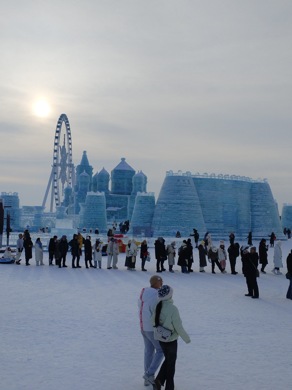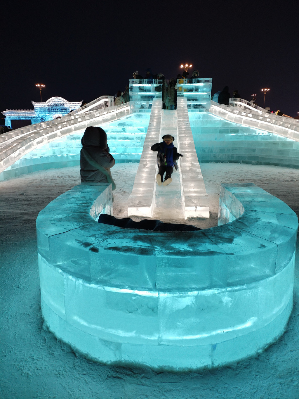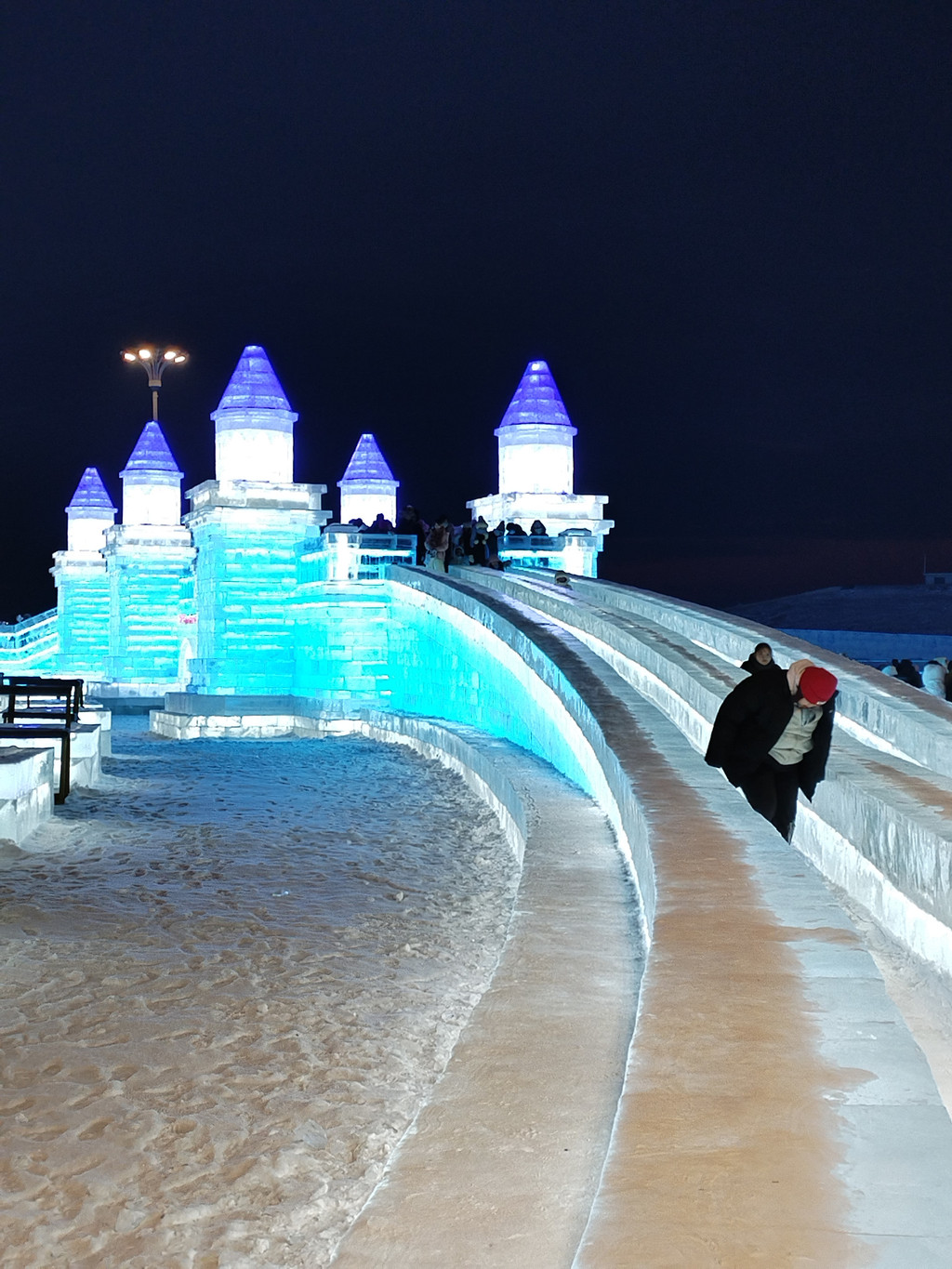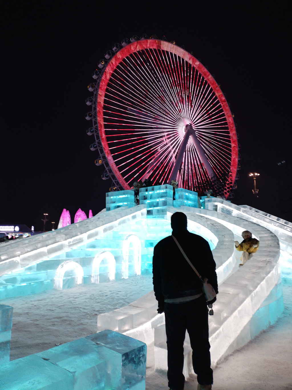 阿李能在冰雪大世界里从中午一直逛到天黑——冬日的尔滨下午四点多就天黑了,既看到了阳光下的冰雕晶莹清纯,又看到了彩灯下的冰雕梦幻多情,暖宝宝功不可没啊!当然,冰雪大世界里的大滑梯和摩天轮,阿李并没有因为有暖宝宝而玩上:一是手速不够快,预约不上;二是即使预约上了,排队也要很长时间,阿李等不起哦。