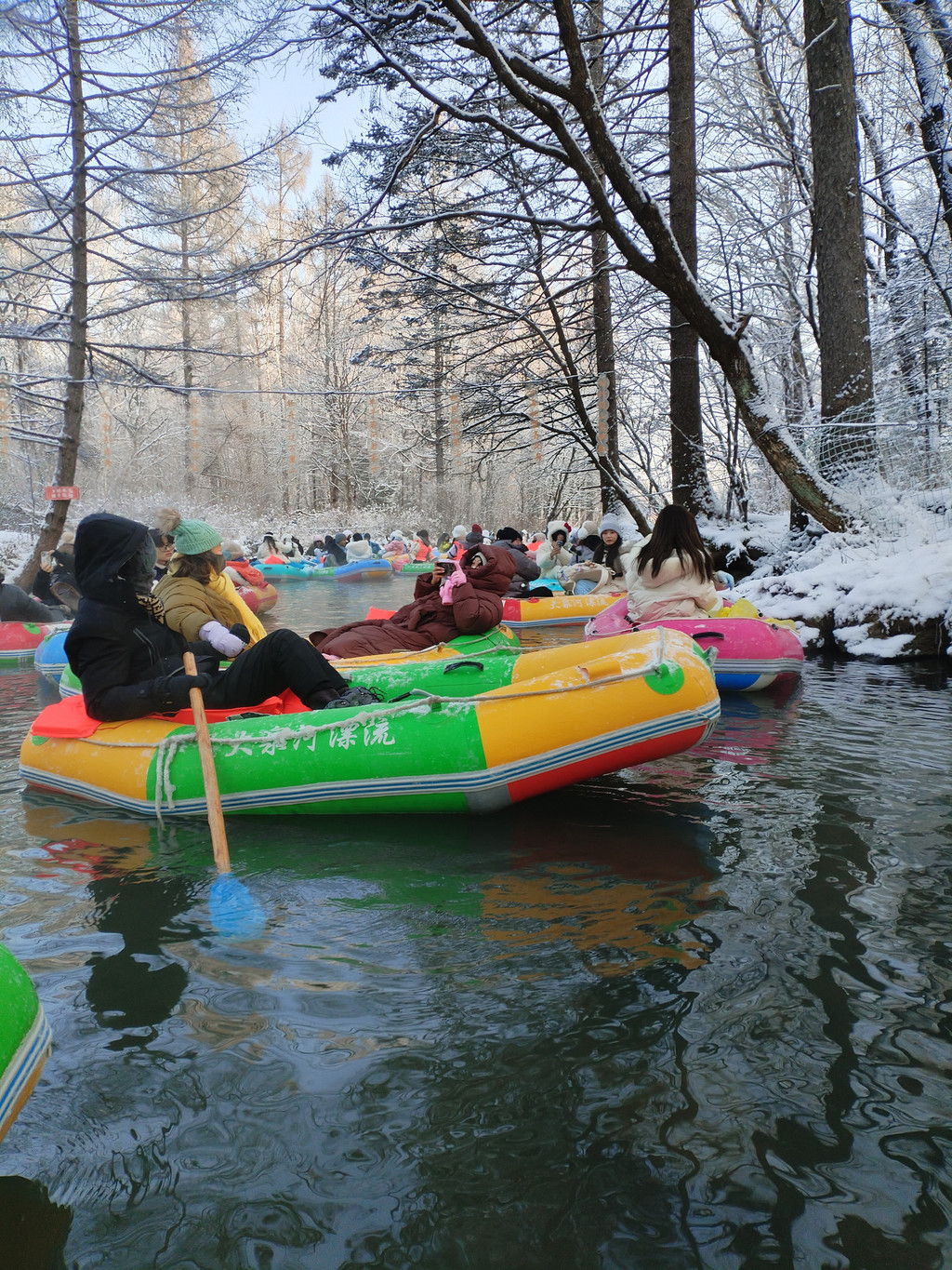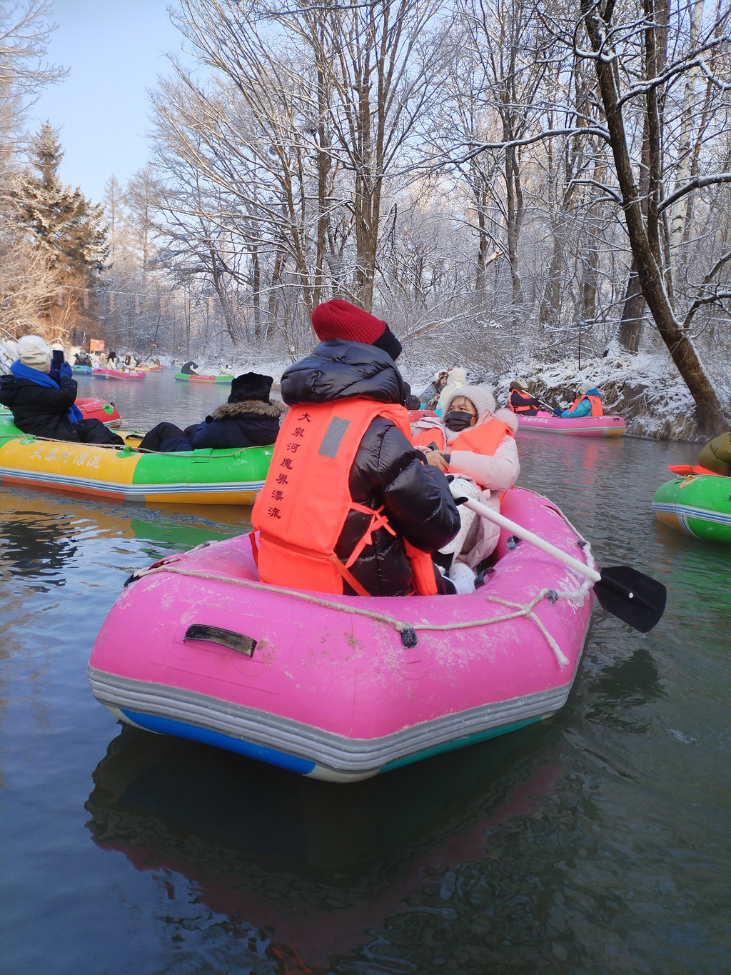 次日清早,我们又去了长白山脚下的大泉河魔界漂流。大泉河的河水来自长白山,而长白山温泉资源丰富。因为有温泉水汇入,所以大泉河冬天也不结冰。小河两岸是茂密的树林,此时树木都已化为玉树琼枝,为我们生动诠释了什么是雾凇景观。河水本来就非常清澈,加上周围冰雪世界的映衬,更是显得温润可亲。我们坐在橡皮艇上,不需要动手划桨,小艇自会随波逐流,顺着河道,漂流到三公里外的终点。因为游客众多,窄窄的河面上都是密密麻麻的橡皮艇,你碰我一下,我碰他一下,好似坐碰碰船一般。碰来碰去,碰来阵阵笑声。大泉河水流平缓,没有急流险滩,不用担心安全问题,可以放心大胆地任由小艇互碰,自己则可以尽情欣赏周围奇幻的雾凇美景!冬日里能够在东北的一条河里漂流,还能够一边漂流一边欣赏两岸雾凇景观,这本身就是一件奇幻的事啊!