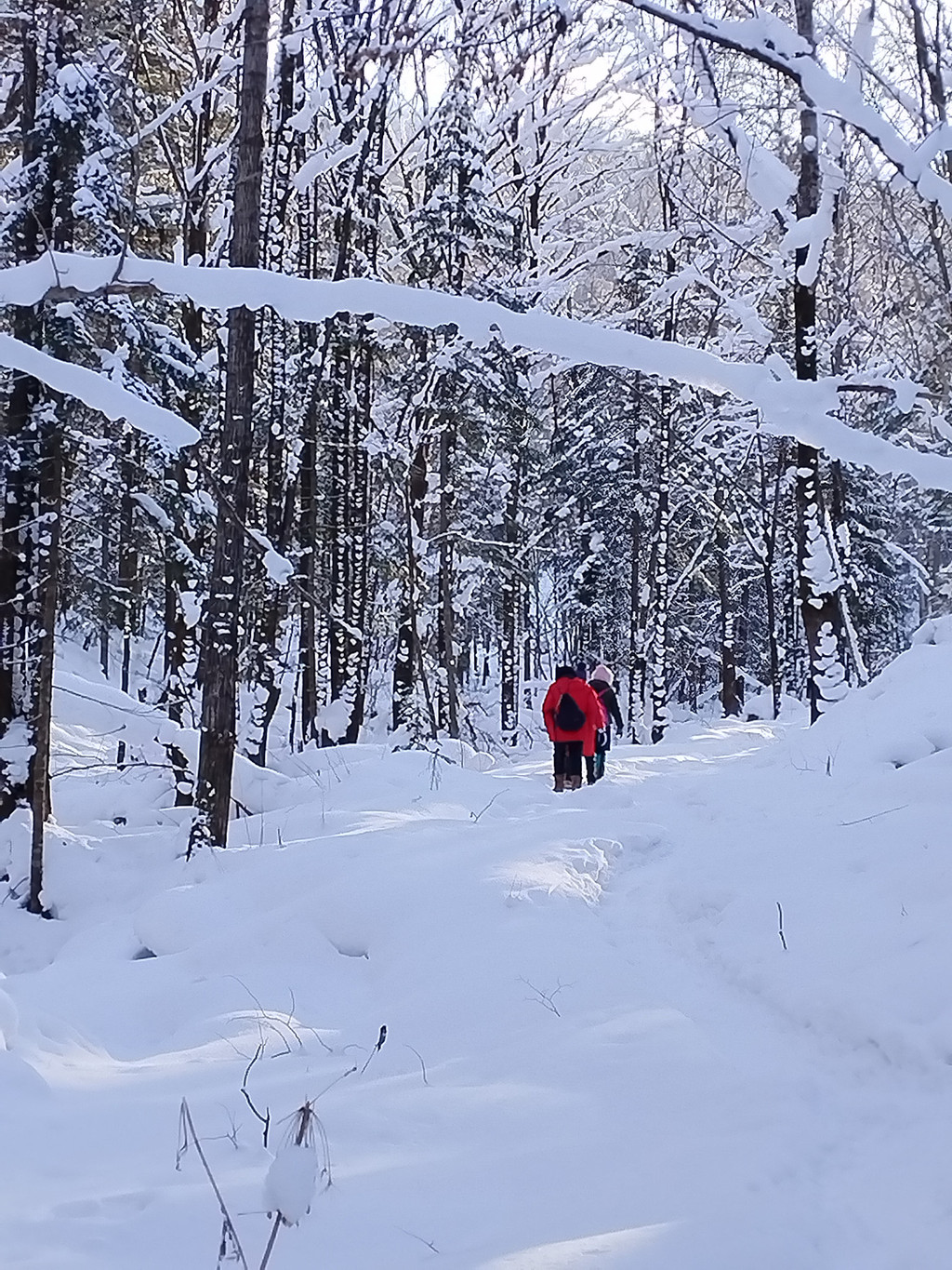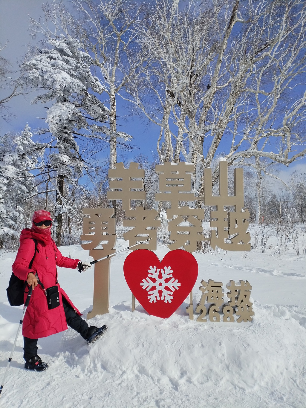 阿李选择全程徒步。早上八点,我们一行人从酒店出发,先是走积雪不是很厚的公路,然后进入积雪渐深的羊草山林间小路。羊草山海拔1268米,树林茂密,树上地上都是厚厚的雪,白茫茫一片。我们就在这样的林海雪原中,奋力向羊草山之巅进发。越往山上走,积雪就越厚,坡度也越大,攀爬的难度也越大,但不用担心无路可走或走错路,因为林海中只有一条徒步小路,沿途插着红旗,在白雪的映衬下红旗格外醒目,清楚地为游客指明前进方向;陡峭的山坡上,路旁树木间拉着粗粗的长绳,供游客攀援。