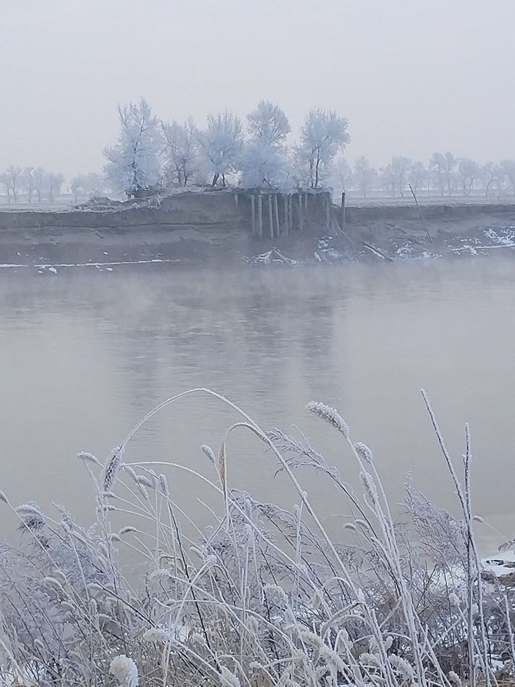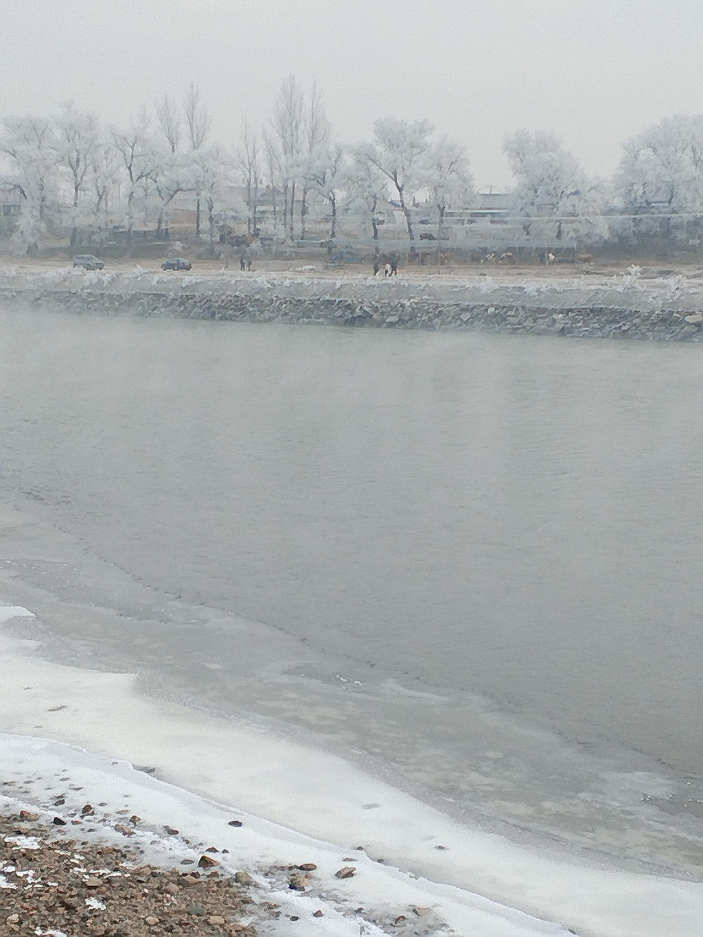 雾凇岛是我们这次冬游东北的最后一站。它是松花江中一个小岛。我们在哈尔滨看到的松花江是结了厚厚冰层的,江中的冰成了冰雪大世界冰雕用冰的来源,江面也变成人们溜冰的场所;冬日里的松花江在其它地方也都是江面冰封的,而只有在吉林市这里,松花江江水汤汤,奔流不息,江面上还水汽蒸腾,四处弥漫。