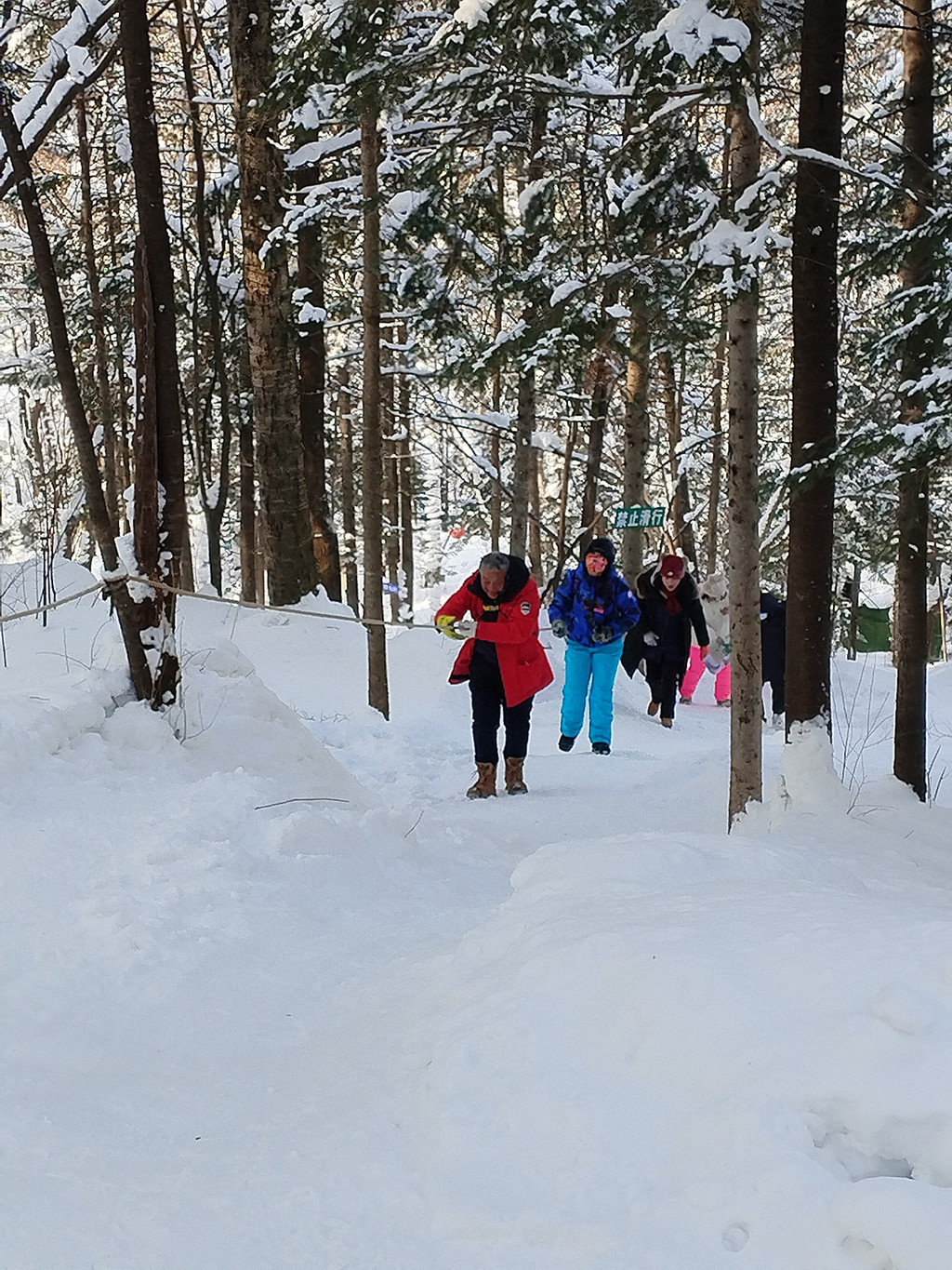 中国雪谷在黑龙江省哈尔滨五常市,中国雪乡在吉林省延边州敦化市。虽然属于不同的省市,但它们是邻居,紧密相连:从中国雪谷出发,翻过羊草山,走下狗熊岭,就来到了中国雪乡,全程约十七公里。现在,从中国雪谷徒步到中国雪乡,是众多户外爱好者冬游东北行程中的最爱。我们团有四十多个人,选择全程徒步的有十几个人,选择前半程坐马拉爬犁、雪地摩托后半程徒步的有十几个人,剩下的人则选择乘车直接从雪谷坐到雪乡。