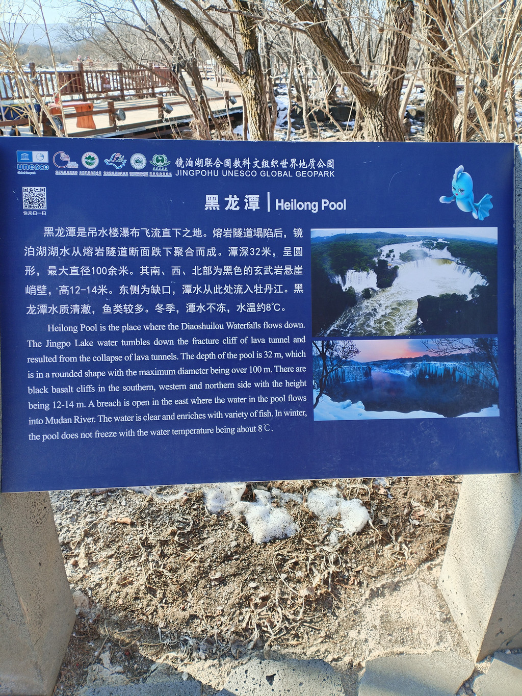 写到这里,阿李突然一惊:等等,黑龙潭的碧水为何还能仓皇东逃?松花江结冰了,镜泊湖结冰了,吊水楼瀑布也结冰了,黑龙潭里的水怎么没有结冰呢?难道黑龙潭里面真有一条黑龙在水里翻腾,不让潭水冻住?阿李急忙上网查了一下,原来黑龙潭下面有温泉,加上镜泊湖冰层下面的水和黑龙潭相通,所以潭水终年都不会结冰。