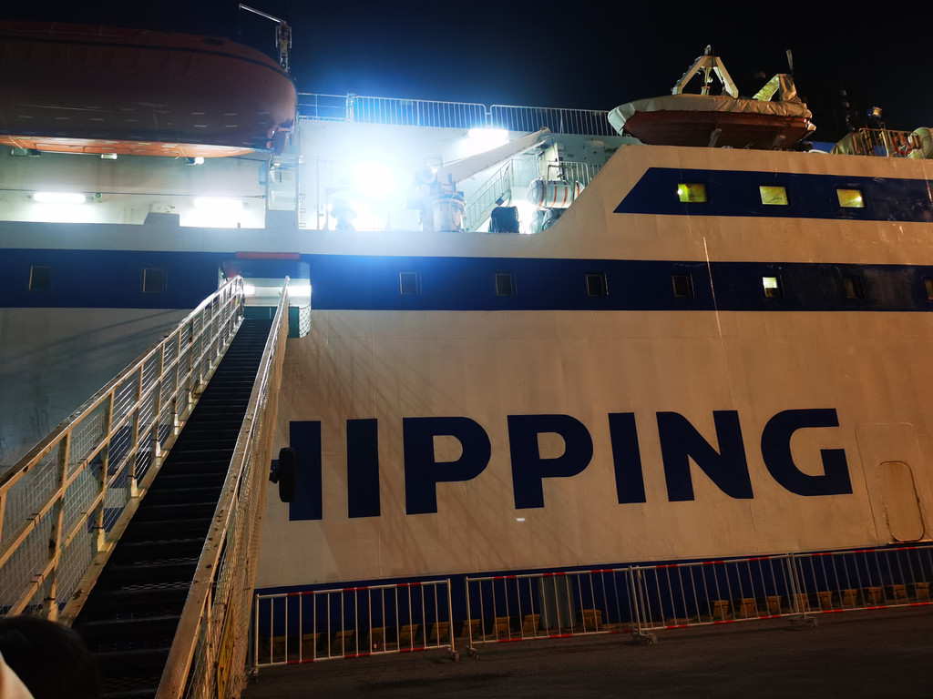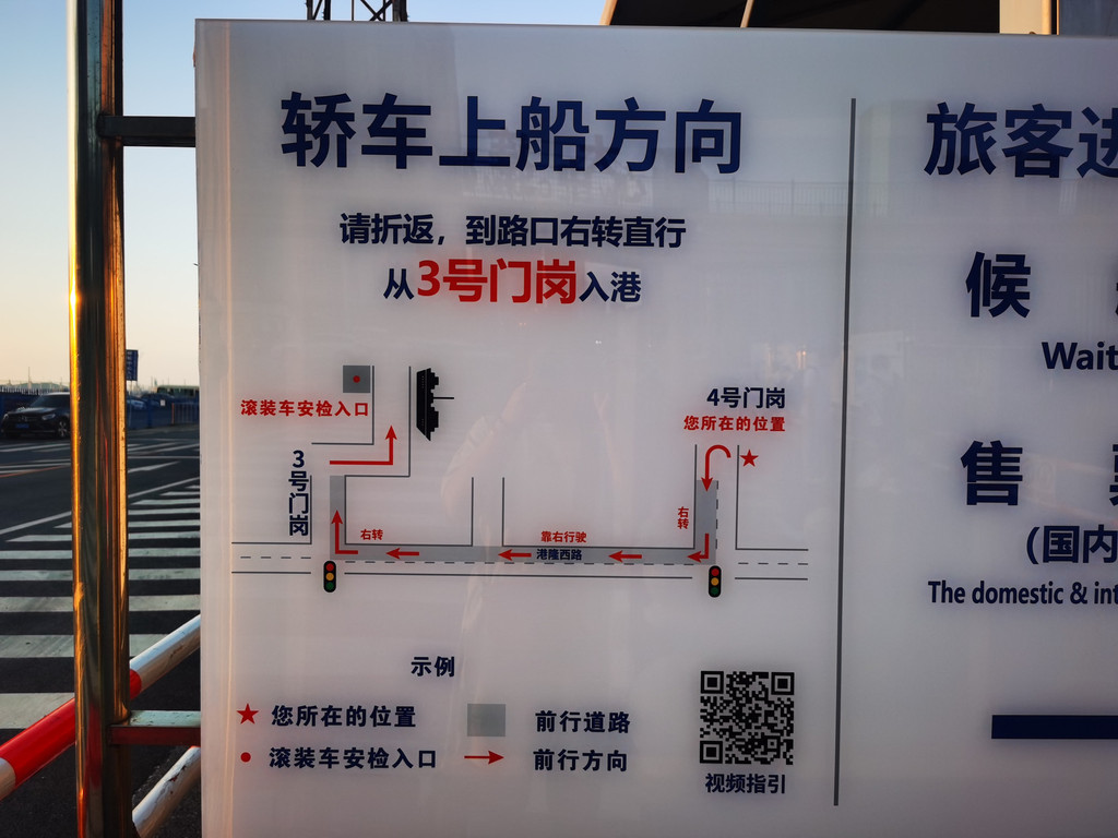 逛到傍晚,本想定个钟点房洗澡换衣服,但是连续找了几家都没空房。结果一家旅店的老板娘推荐我们去街巷前面的本地澡堂,每人十多块钱就能解决洗澡换衣服的问题。我们便临时决定去体验一番,澡堂不大却收拾得干净,热水冲刷着身体,连日赶路的疲惫瞬间消散。换上干净衣服,浑身清爽地开车直奔轮渡港口(这里紧邻昨天我们参观的老码头帆船基地),在3号门顺利换好船票与车票,然后开车去车辆登船的渡口等着登船。