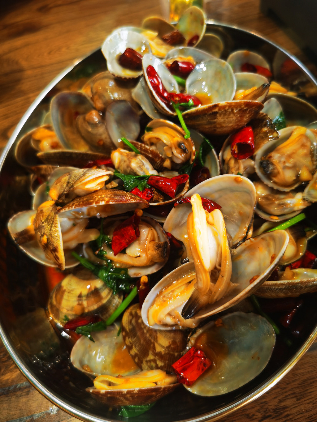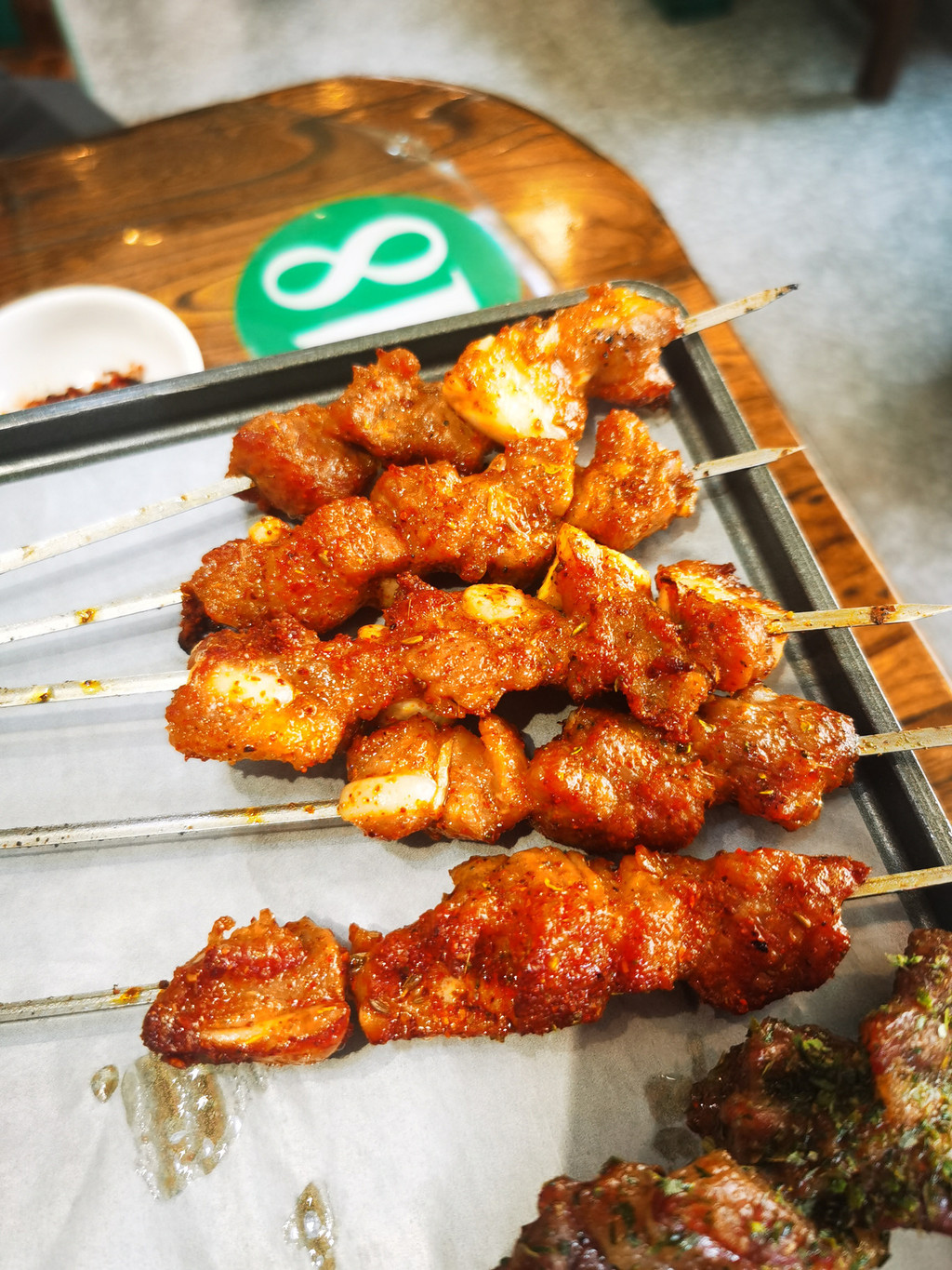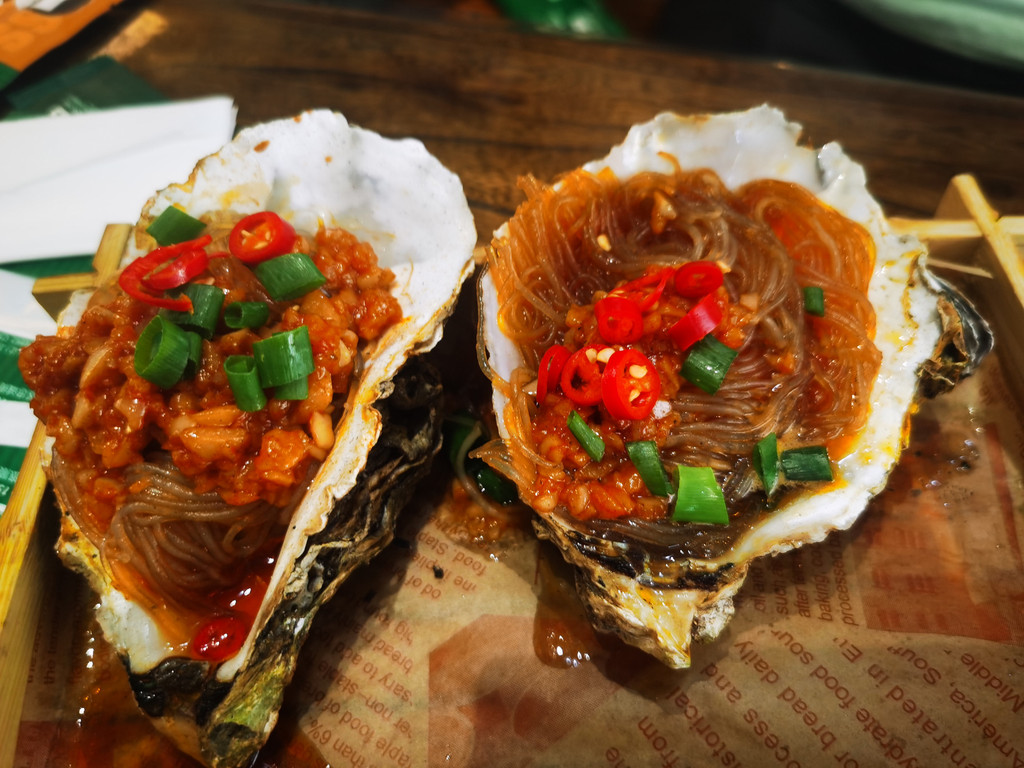 中午的食欲被一顿烧烤唤醒,八班烧烤店里早已坐满了食客。我们团了一个双人餐:海肠捞饭的米饭太硬了我不喜欢。生蚝味道不错,我吃了两个。刚烤好的大油边滋滋冒油,撒上孜然与辣椒面,一口下去肉香四溢。麻辣排骨串、雪花牛肉串都被大油边生生的比了下去。辣炒蛤蜊、花甲粉、炝拌土豆丝都是中规中矩的东北味,不会踩雷。配上冰镇的自制果汁,旅途的疲惫瞬间被抛到脑后。