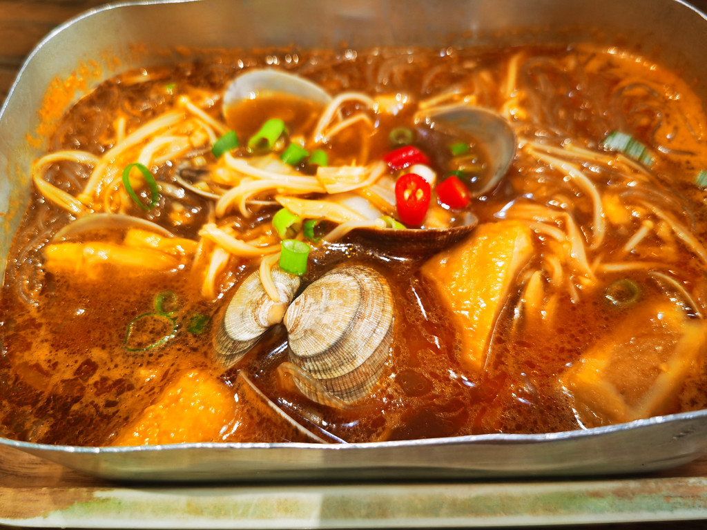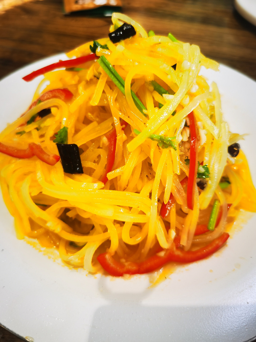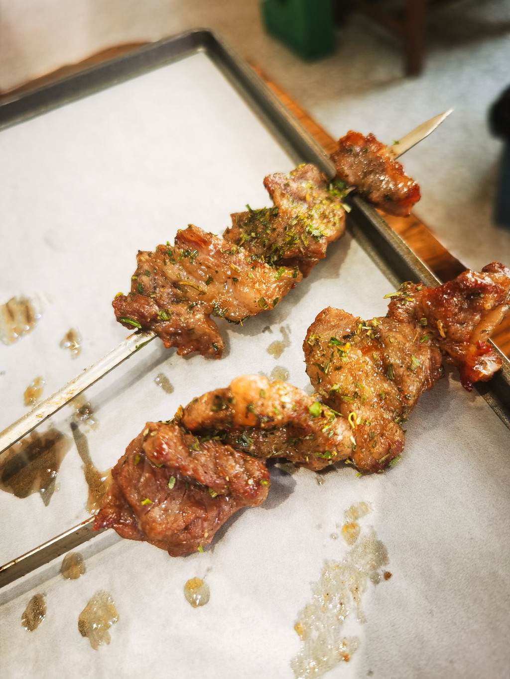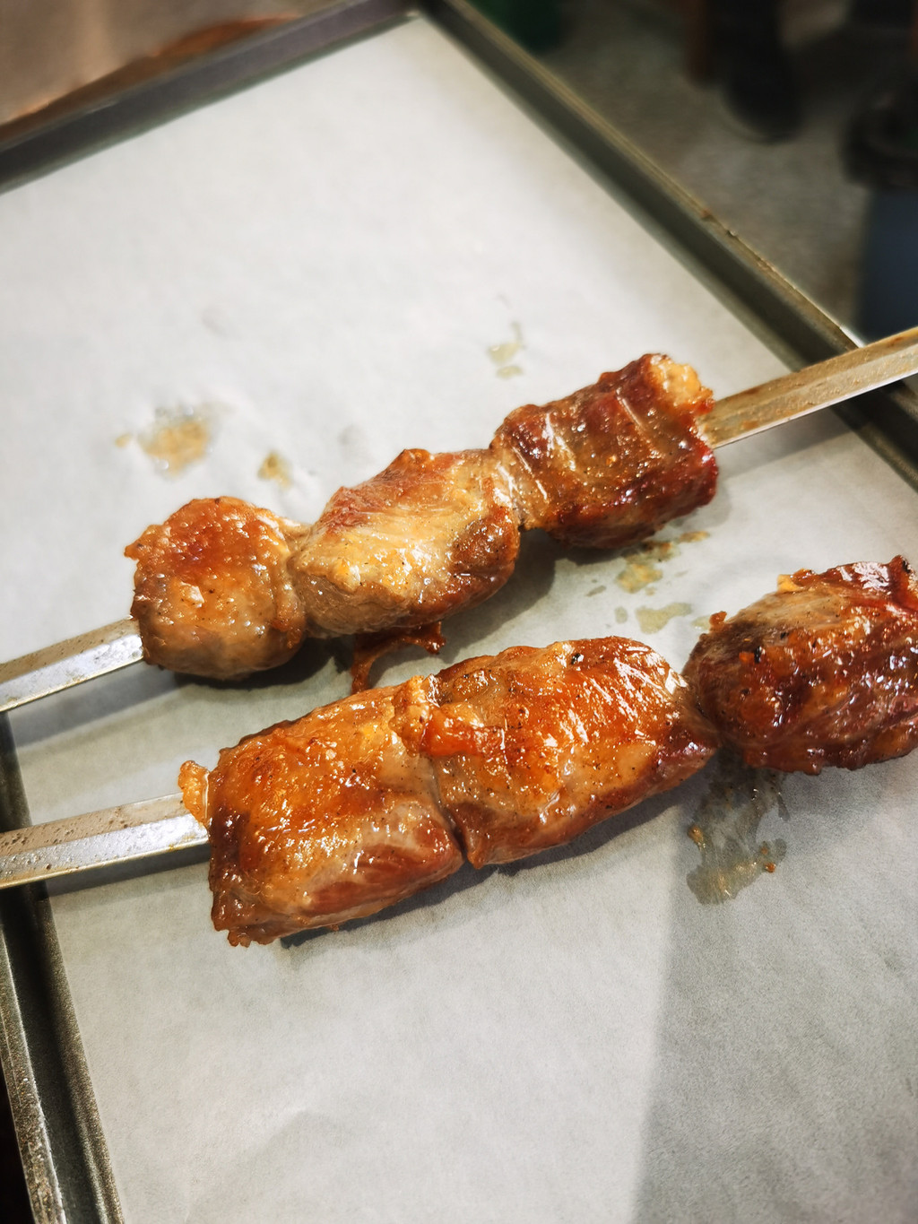 中午的食欲被一顿烧烤唤醒,八班烧烤店里早已坐满了食客。我们团了一个双人餐:海肠捞饭的米饭太硬了我不喜欢。生蚝味道不错,我吃了两个。刚烤好的大油边滋滋冒油,撒上孜然与辣椒面,一口下去肉香四溢。麻辣排骨串、雪花牛肉串都被大油边生生的比了下去。辣炒蛤蜊、花甲粉、炝拌土豆丝都是中规中矩的东北味,不会踩雷。配上冰镇的自制果汁,旅途的疲惫瞬间被抛到脑后。