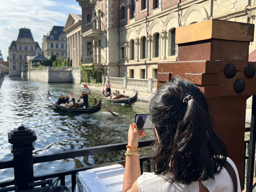 午后的阳光渐烈,驱车前往威尼斯水城。车刚停稳,便被眼前的景致惊艳:蓝白色的建筑复刻着威尼斯的浪漫,运河蜿蜒其间,偶尔有贡多拉缓缓划过,船夫的歌声伴着水波荡漾。沿着步道慢慢逛,随手一拍都是充满异域风情的照片,微风拂过带着水汽的清凉,让人暂时忘却了夏日的燥热。