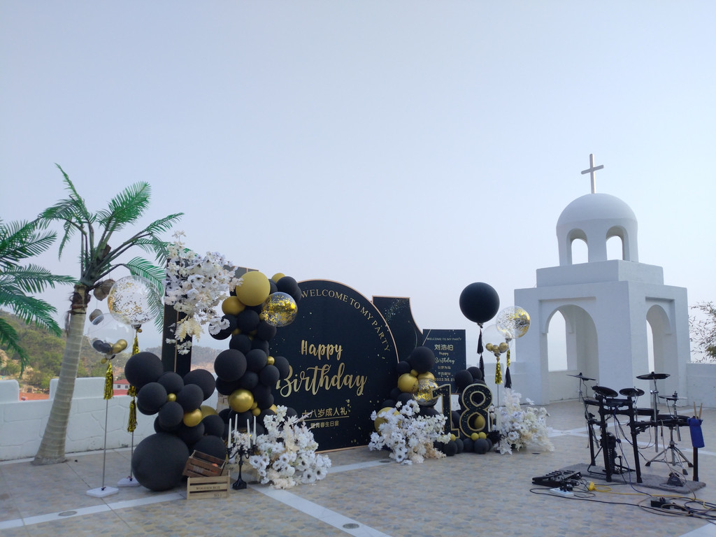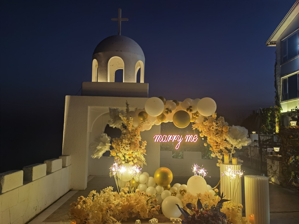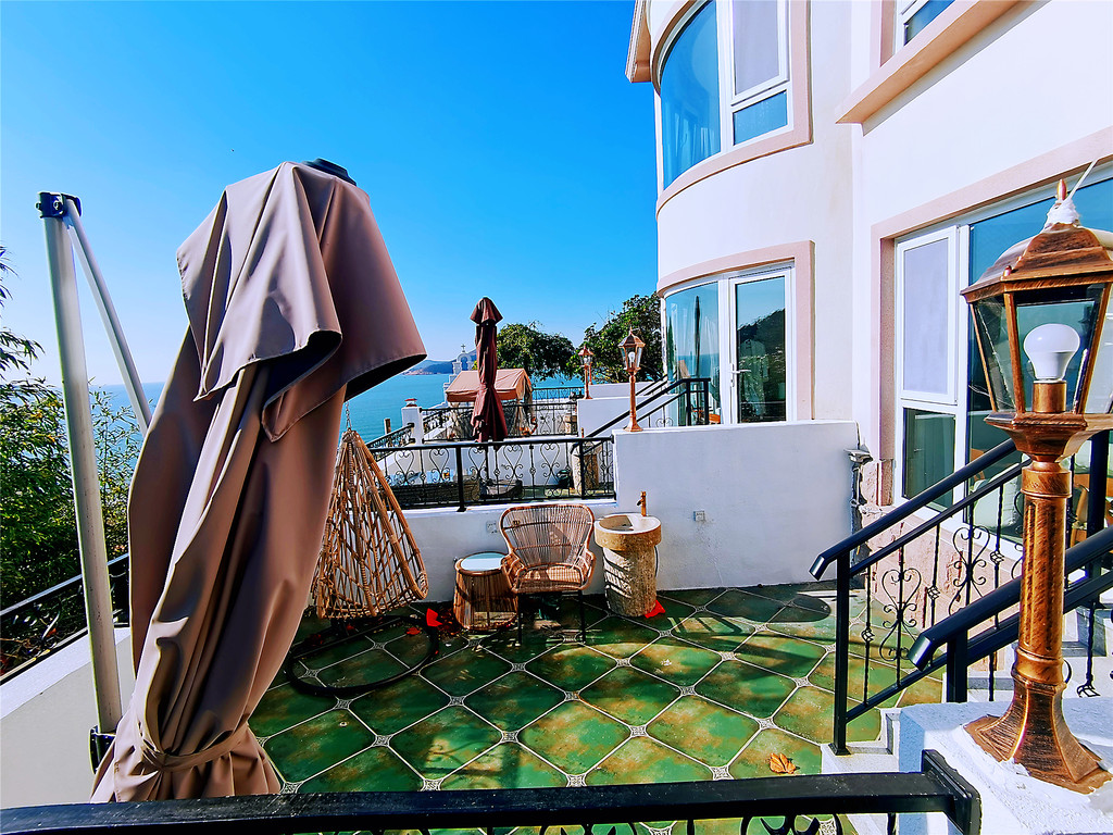 位于崂山天鹅堡主堡门口侧处的希腊爱情堡,地处半山腰,坐山望海。平台面积百余平米,古风暗色花纹地板,白色垛口相围,东南角矗立象征爱情寓意的希腊爱情海风格的弧形堡,绿底白字的“我在天鹅堡很想你”更是增添了一份甜蜜的色彩。