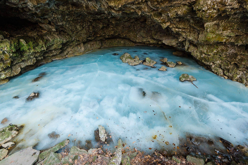 天气寒冷时,积水成冰,这些来自地下和天上的水,没有经过任何污染,凝结出纯净的白色和蓝色,或许也只有在郁郁葱葱的原始森林中才会有如此新鲜干净的空气。