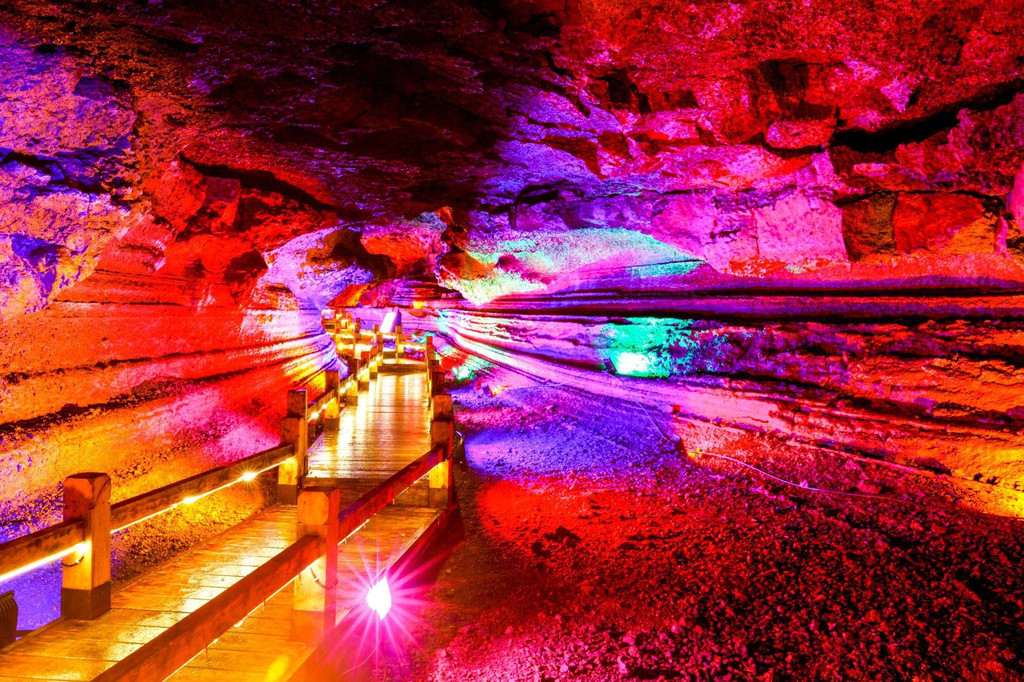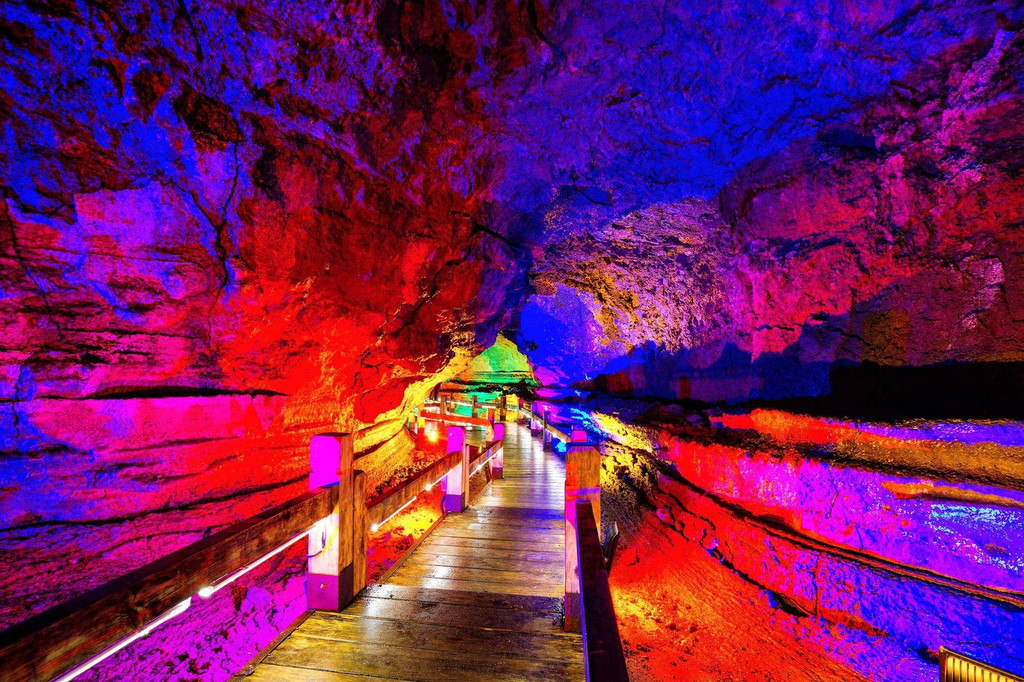 地下熔岩洞内别有洞天,曲径通幽,千变万化,在迷离的灯光下,仿佛走在迷宫之中。