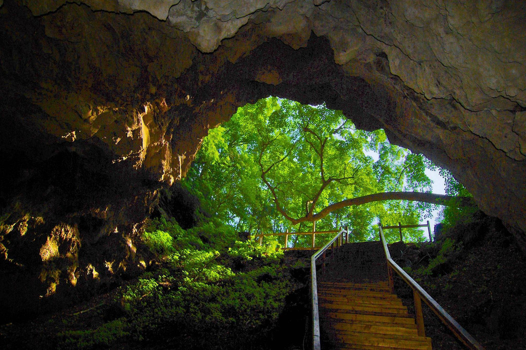 万年之前的三次火山喷发成就了眼前的美景,火山之后,经年累月,植物吸收着日月精华,让坑洞内长出庞大的原始森林,被称为“地下森林”。