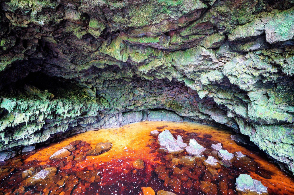 溶洞内的积水呈现出琥珀色,仿佛残留着火山喷发时火焰的颜色。