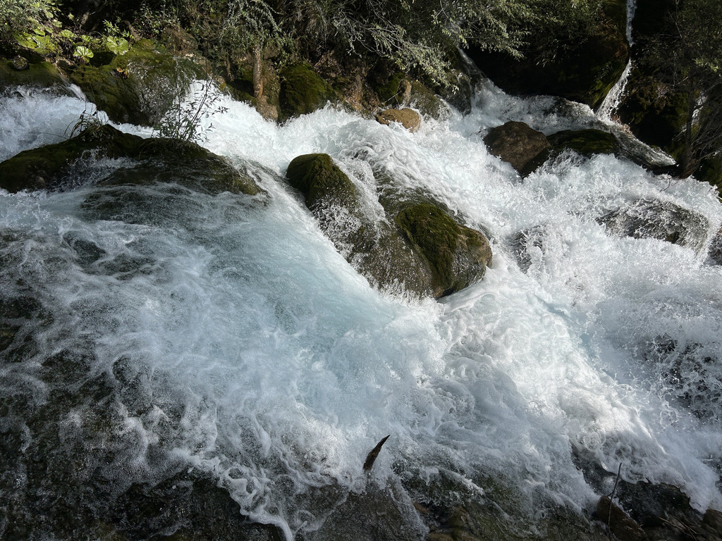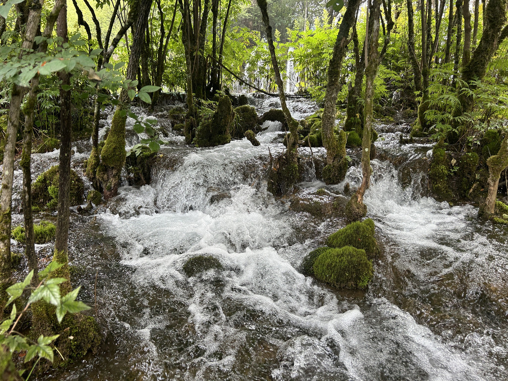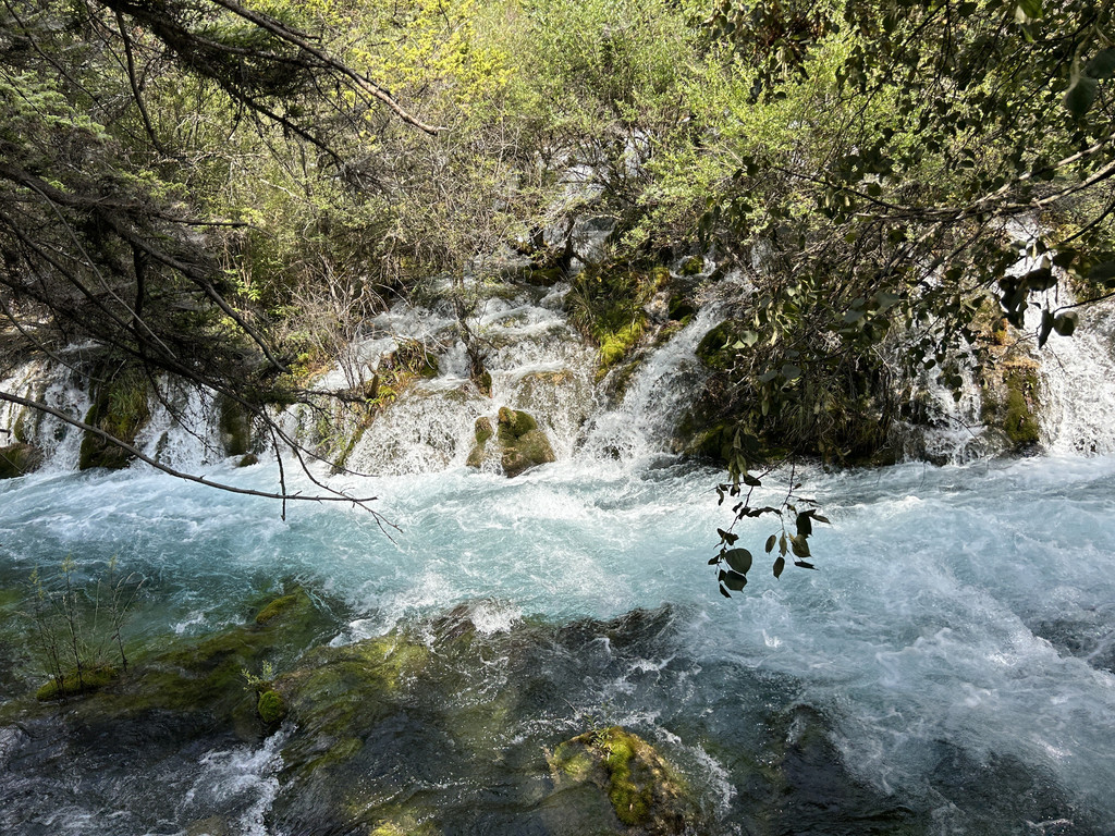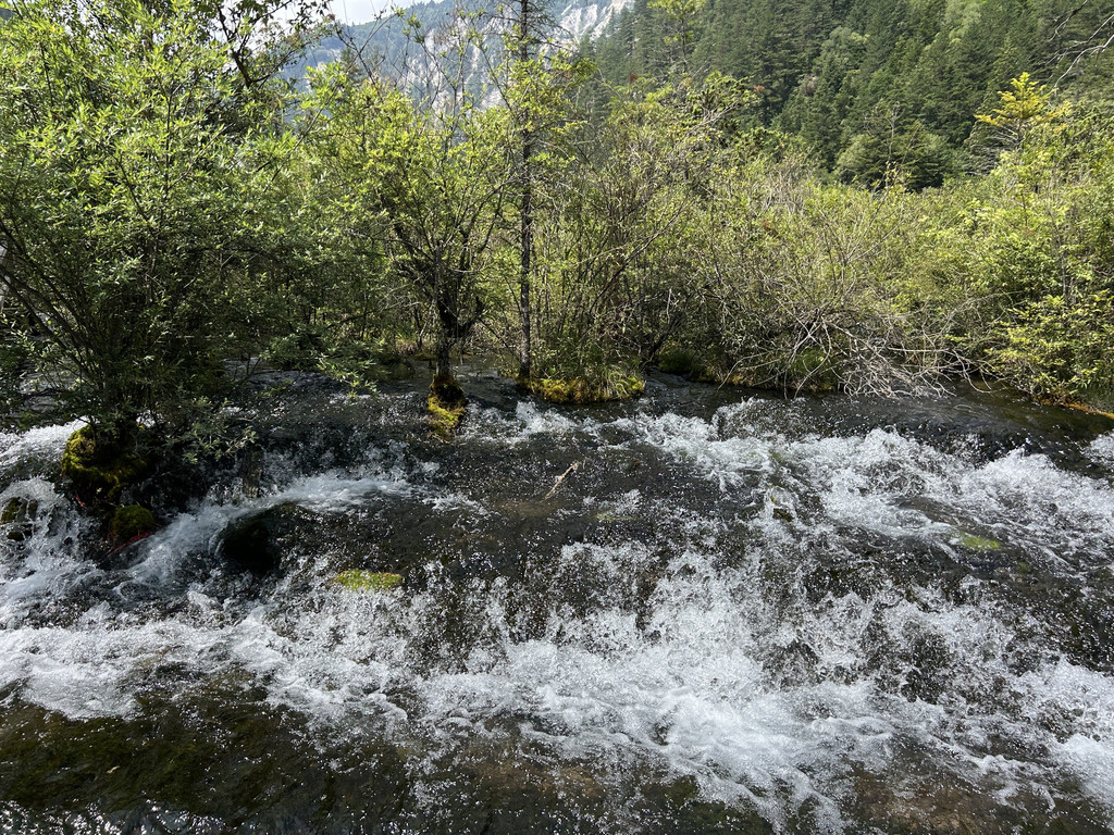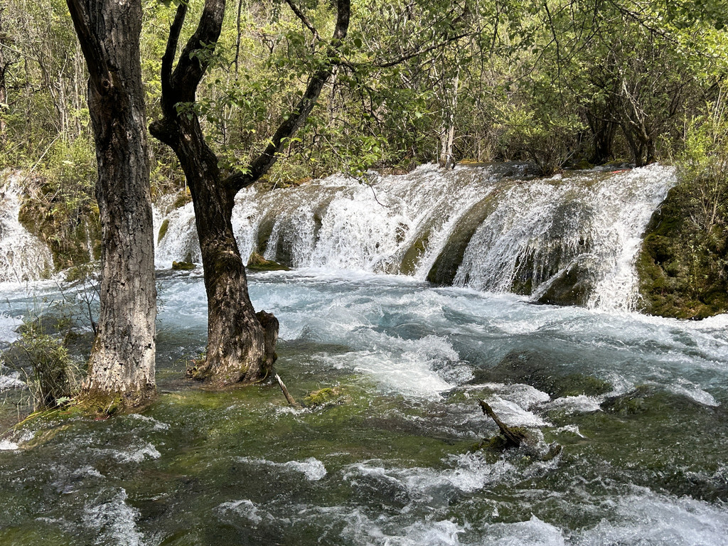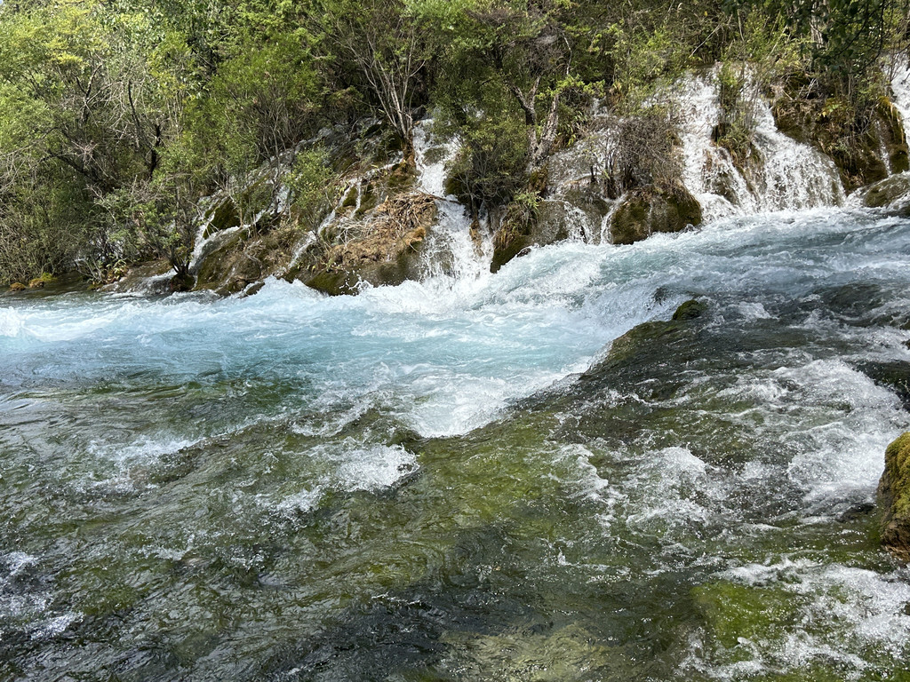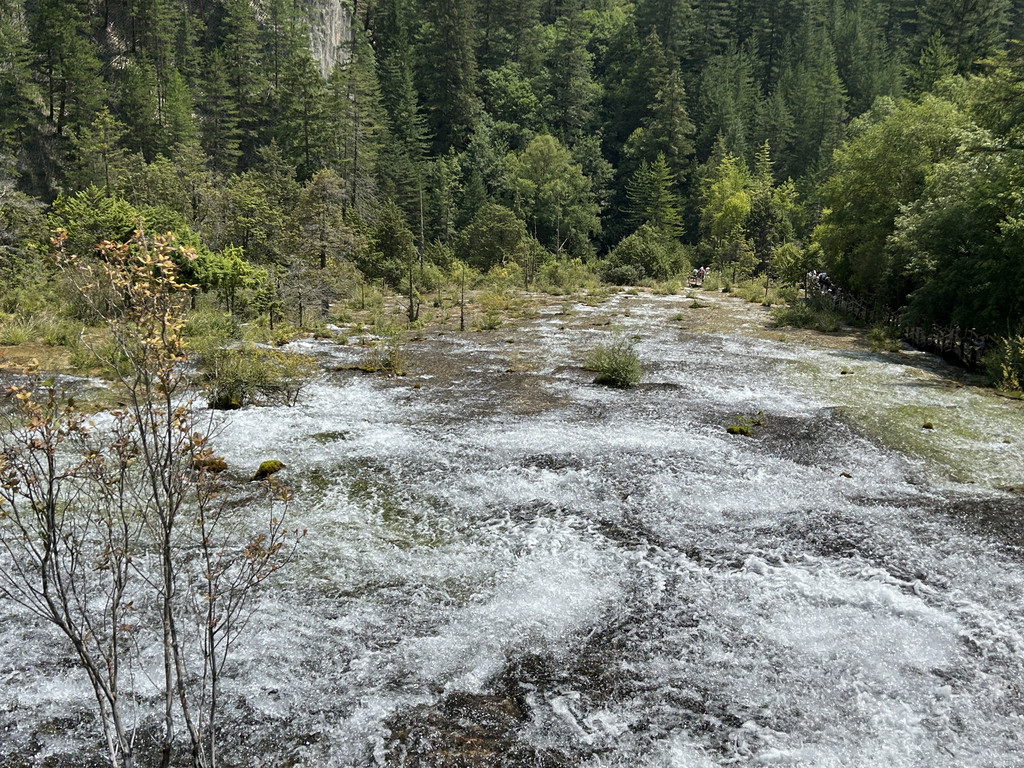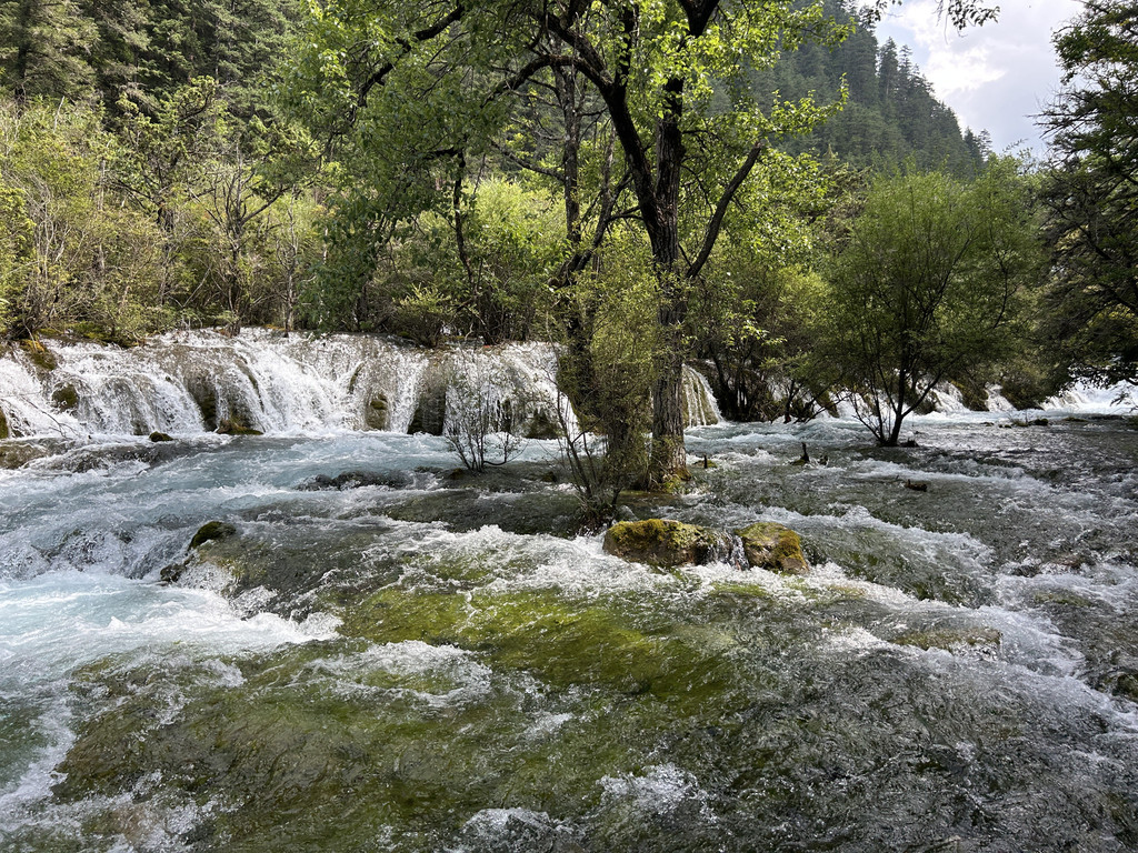 九寨沟的水动到极致的是珍珠滩了。它在五花海与镜海之间,一片世所罕见的钙华滩流。当我置身在这一片滩流之前,真是惊喜莫名。眼前的千折万折流水,千叠万叠急湍,则构成了无穷的自然之美的循环往复。