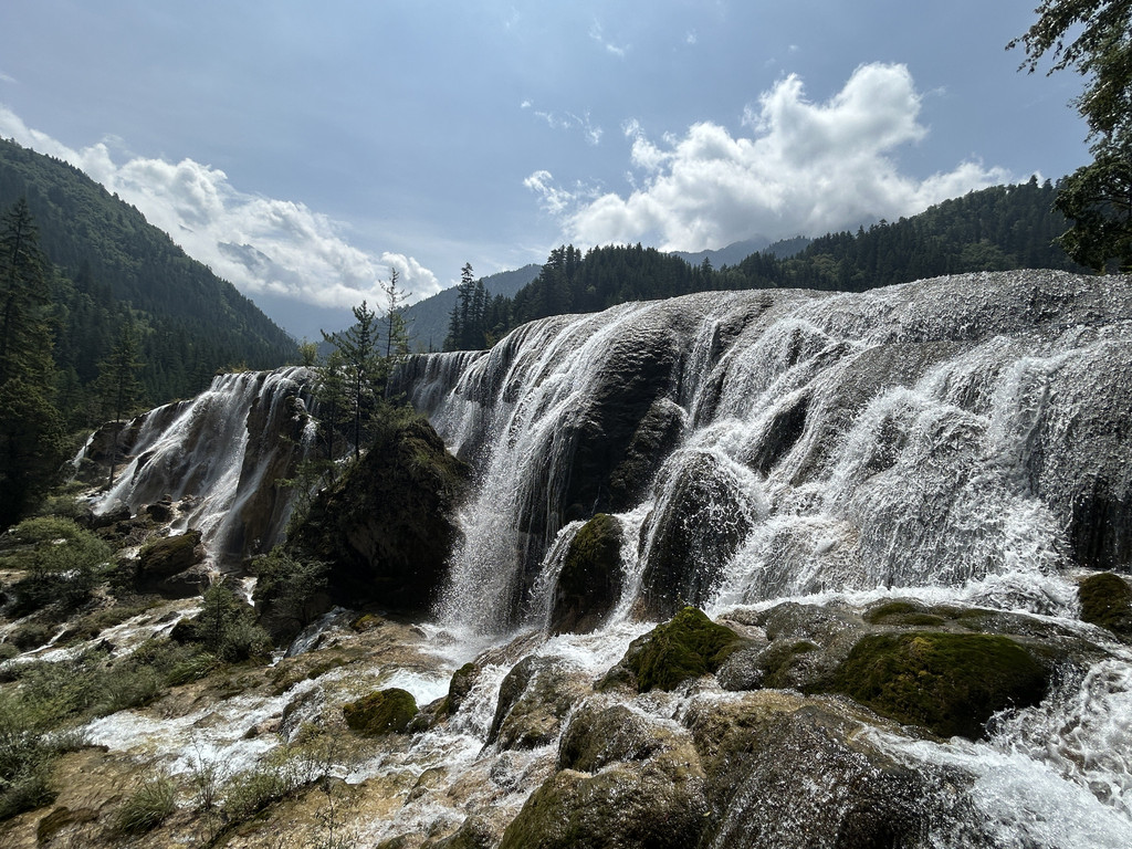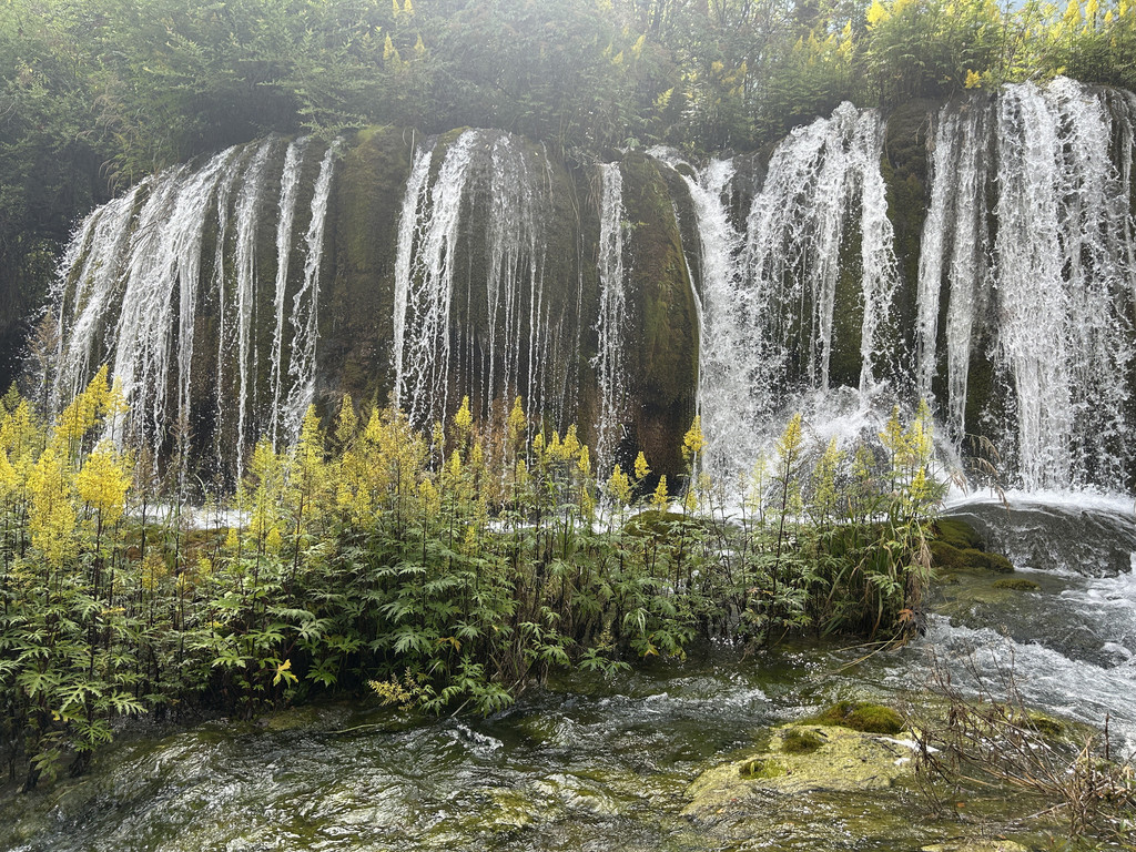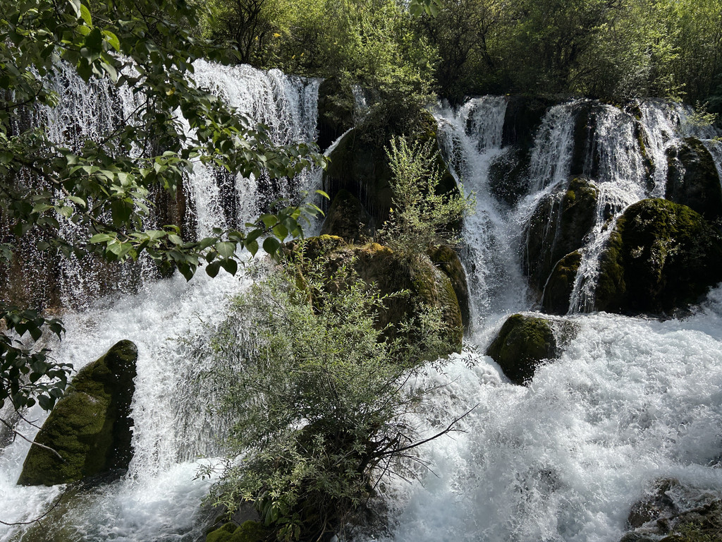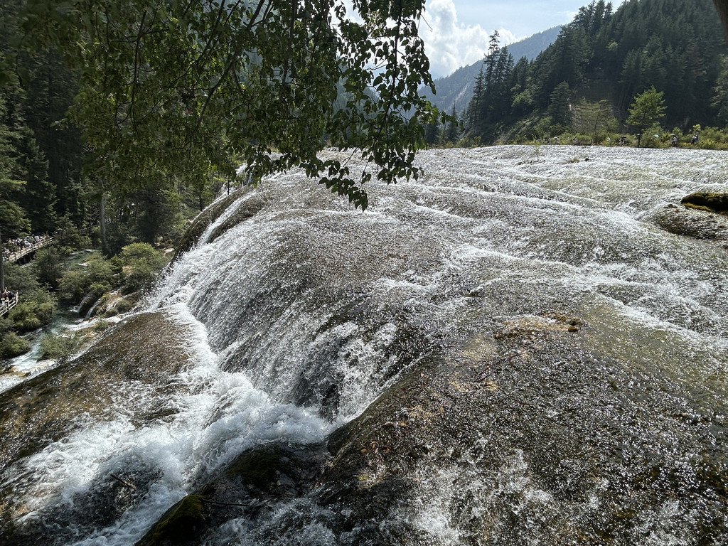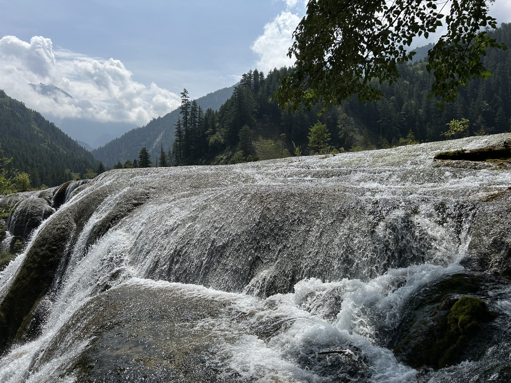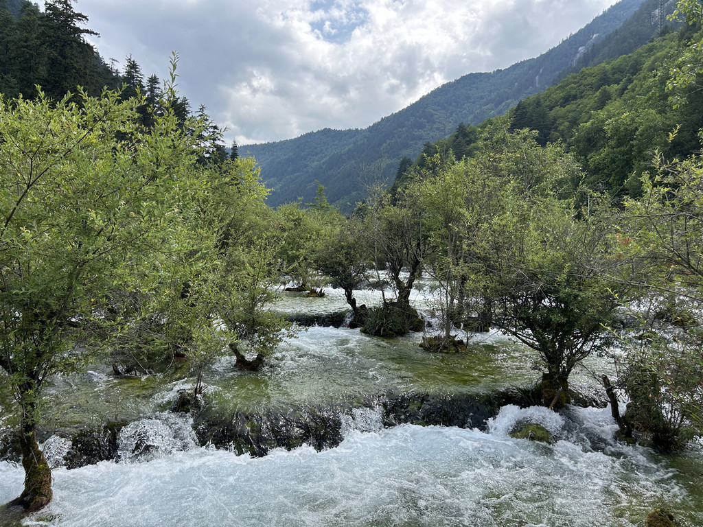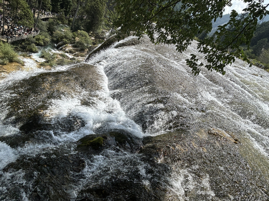 九寨沟的水动到极致的是珍珠滩了。它在五花海与镜海之间,一片世所罕见的钙华滩流。当我置身在这一片滩流之前,真是惊喜莫名。眼前的千折万折流水,千叠万叠急湍,则构成了无穷的自然之美的循环往复。