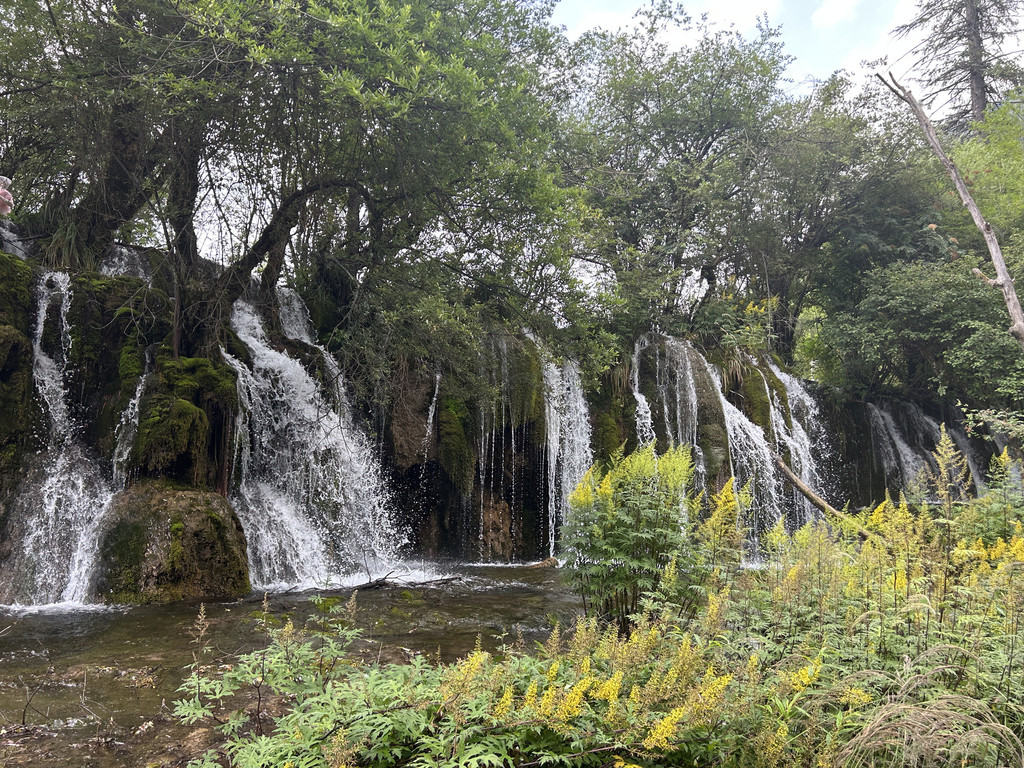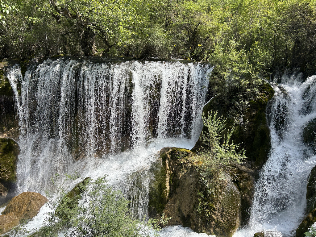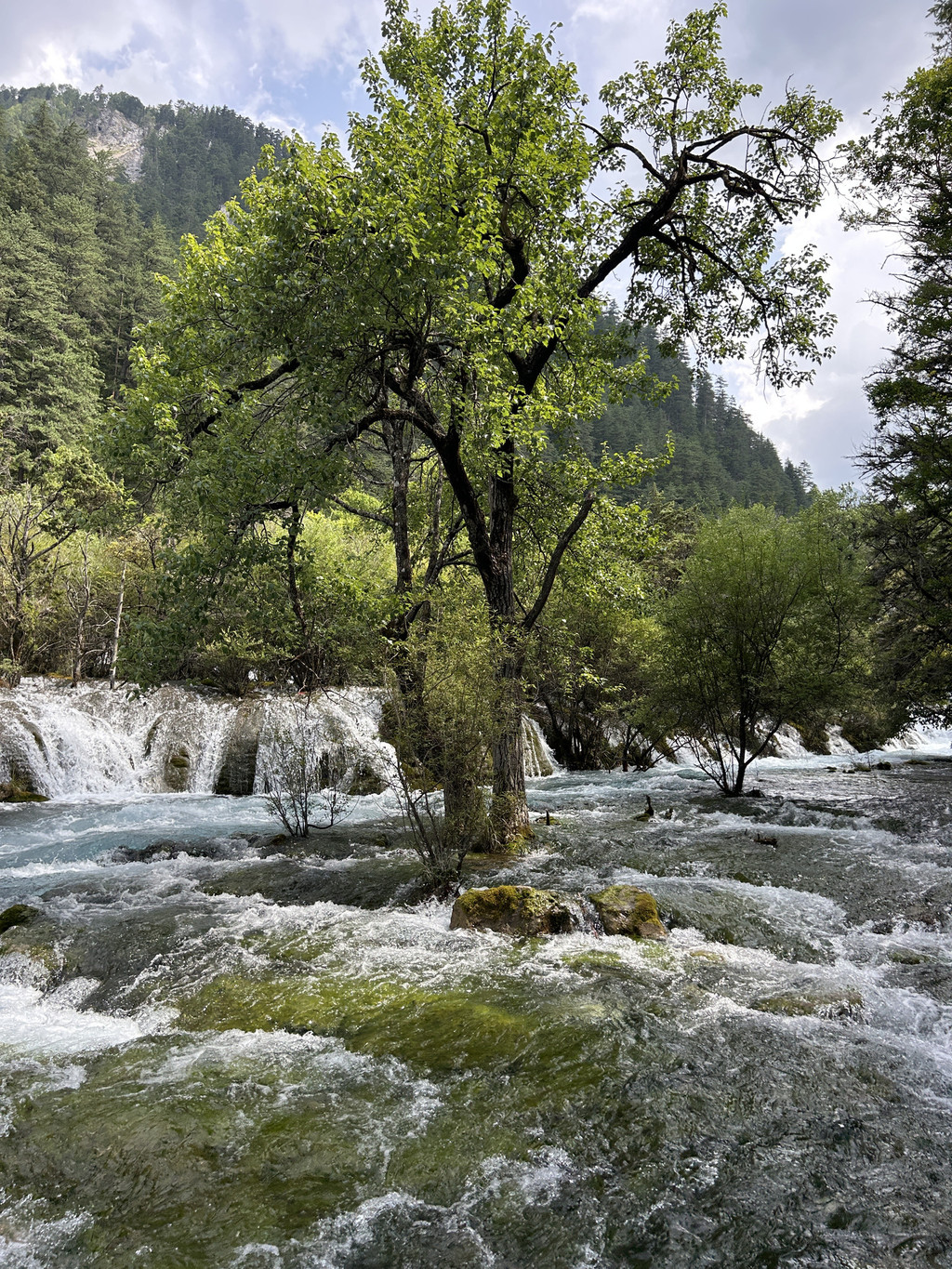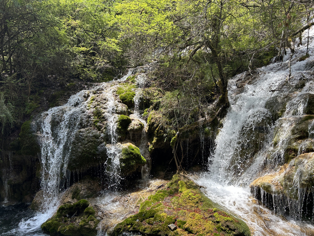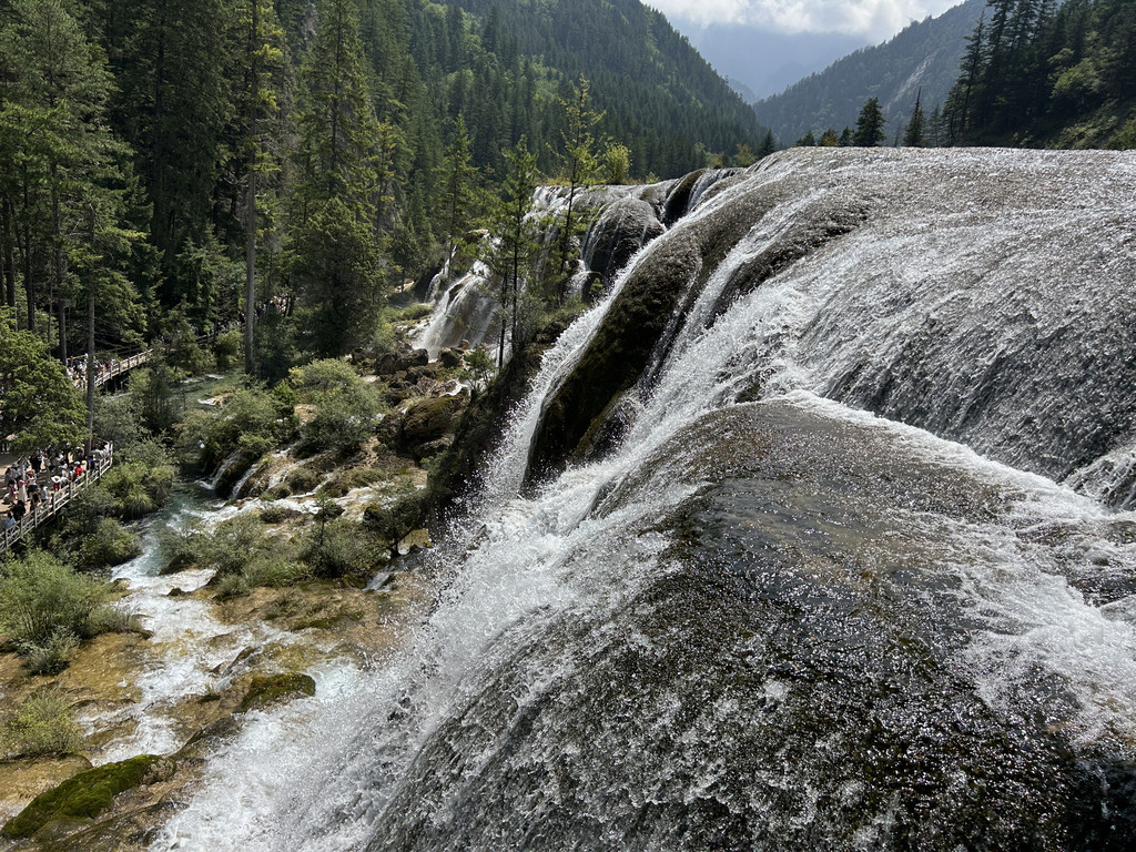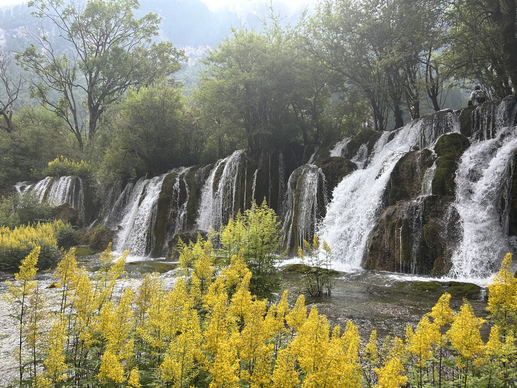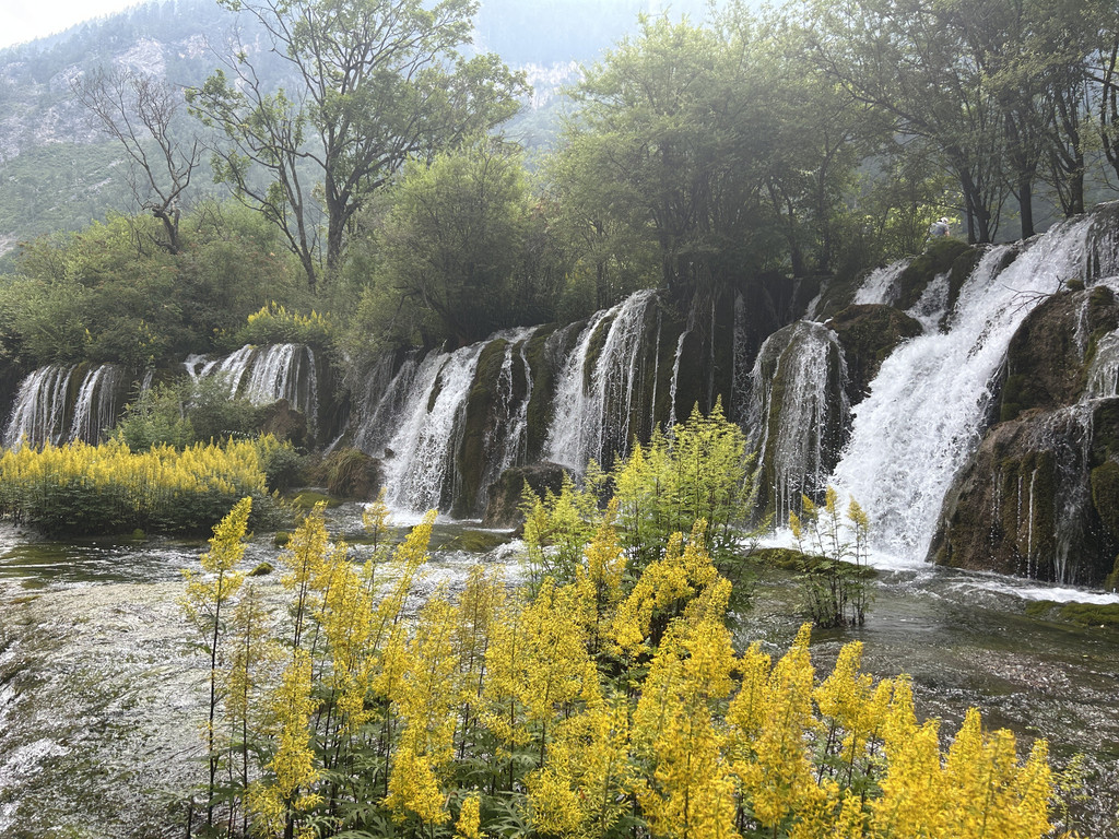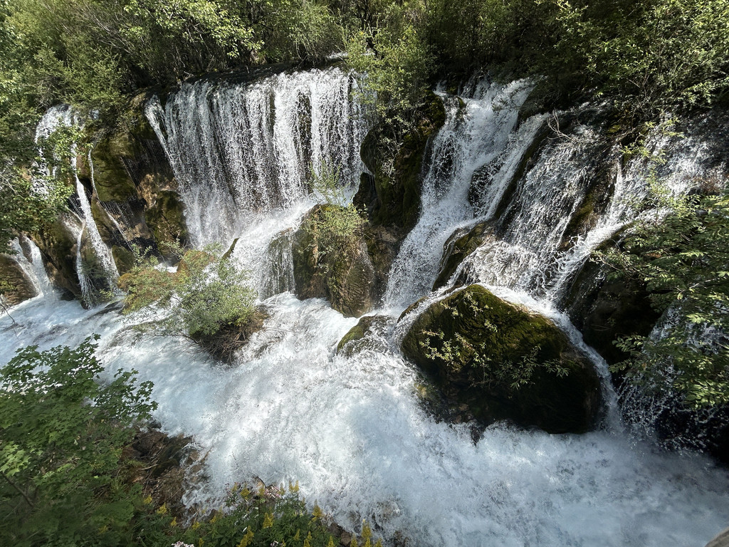 九寨沟的水动到极致的是珍珠滩了。它在五花海与镜海之间,一片世所罕见的钙华滩流。当我置身在这一片滩流之前,真是惊喜莫名。眼前的千折万折流水,千叠万叠急湍,则构成了无穷的自然之美的循环往复。