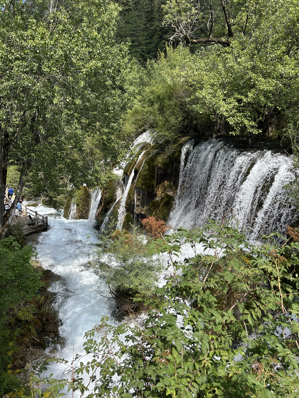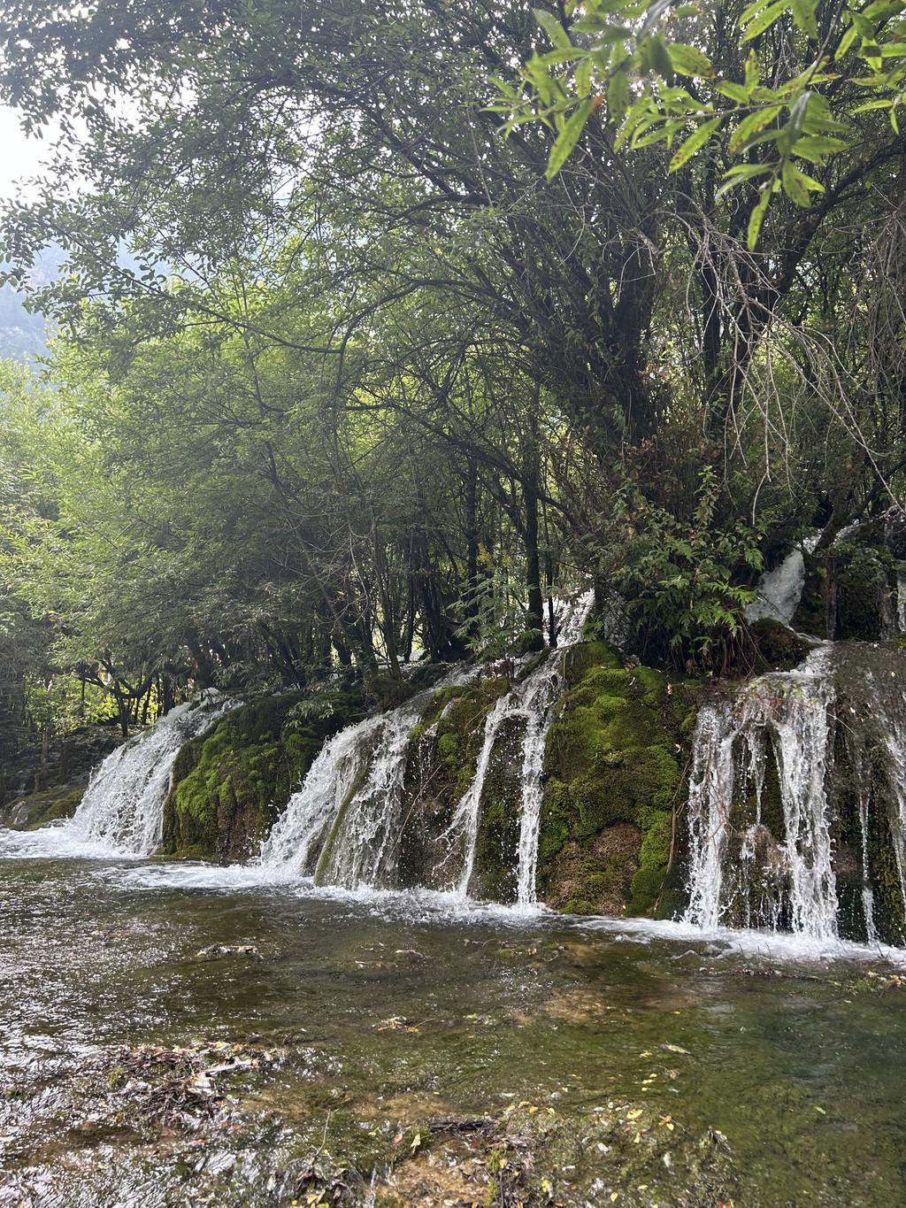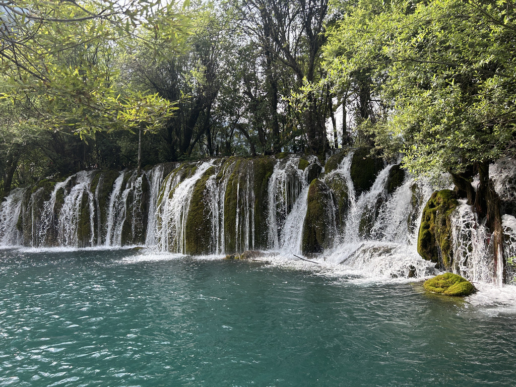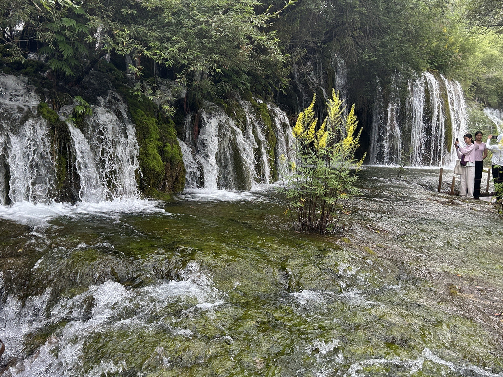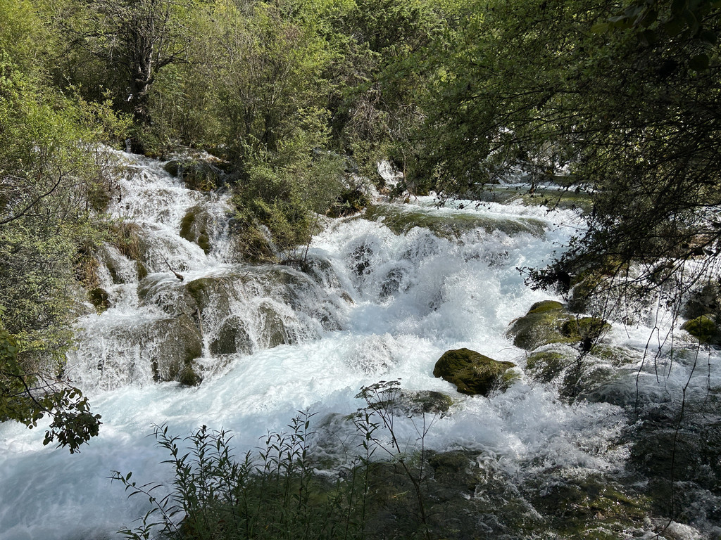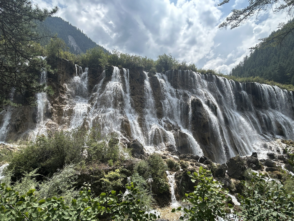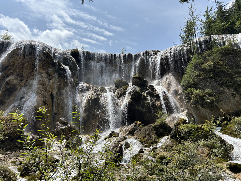 九寨沟的水动到极致的是珍珠滩了。它在五花海与镜海之间,一片世所罕见的钙华滩流。当我置身在这一片滩流之前,真是惊喜莫名。眼前的千折万折流水,千叠万叠急湍,则构成了无穷的自然之美的循环往复。