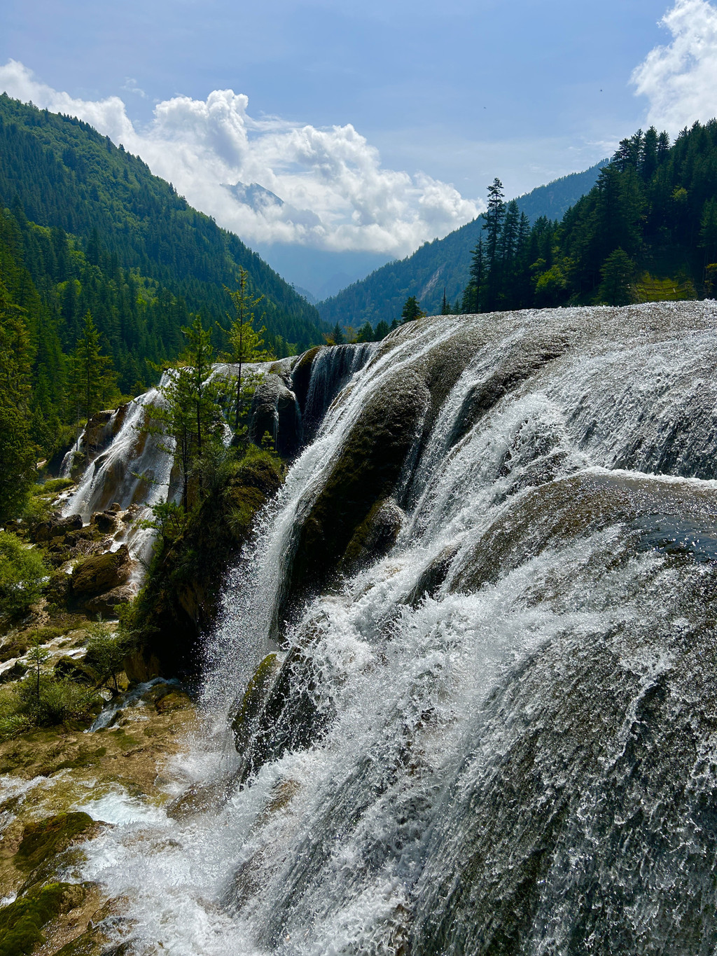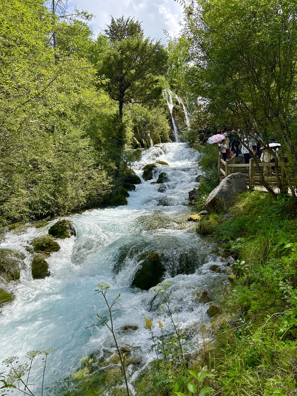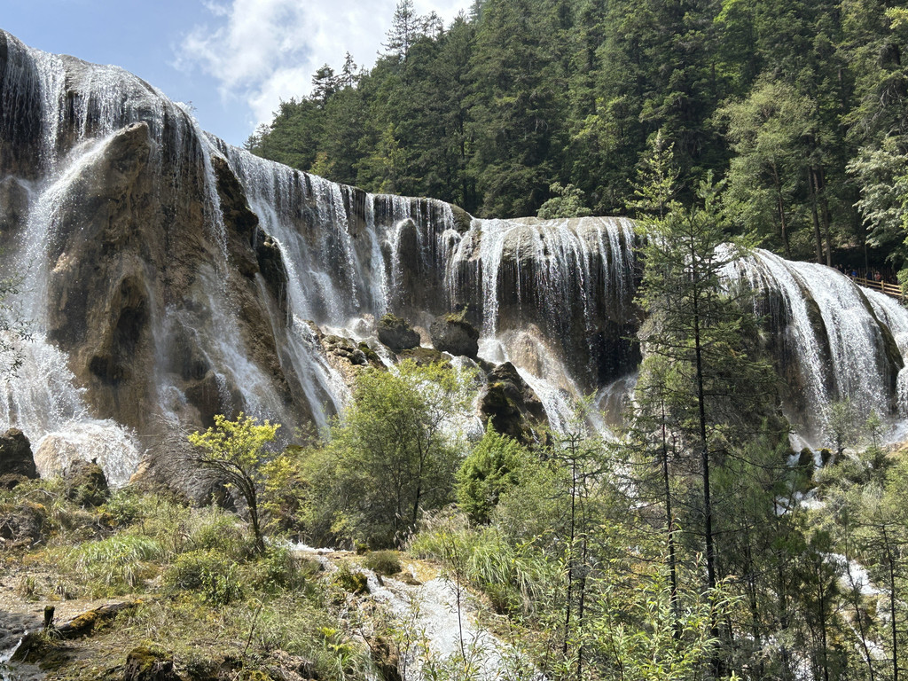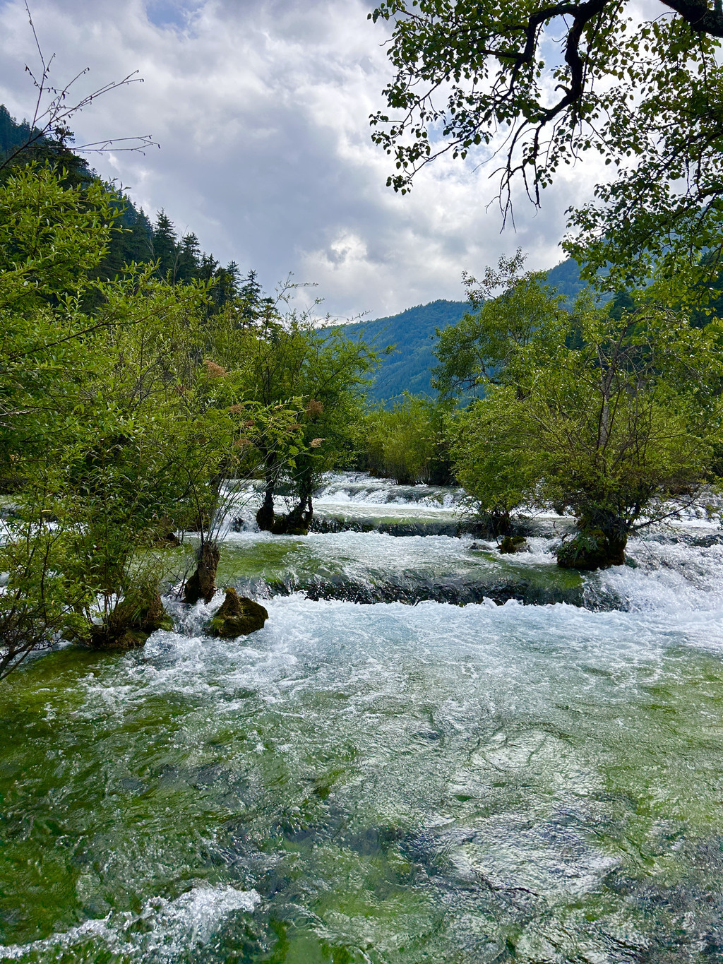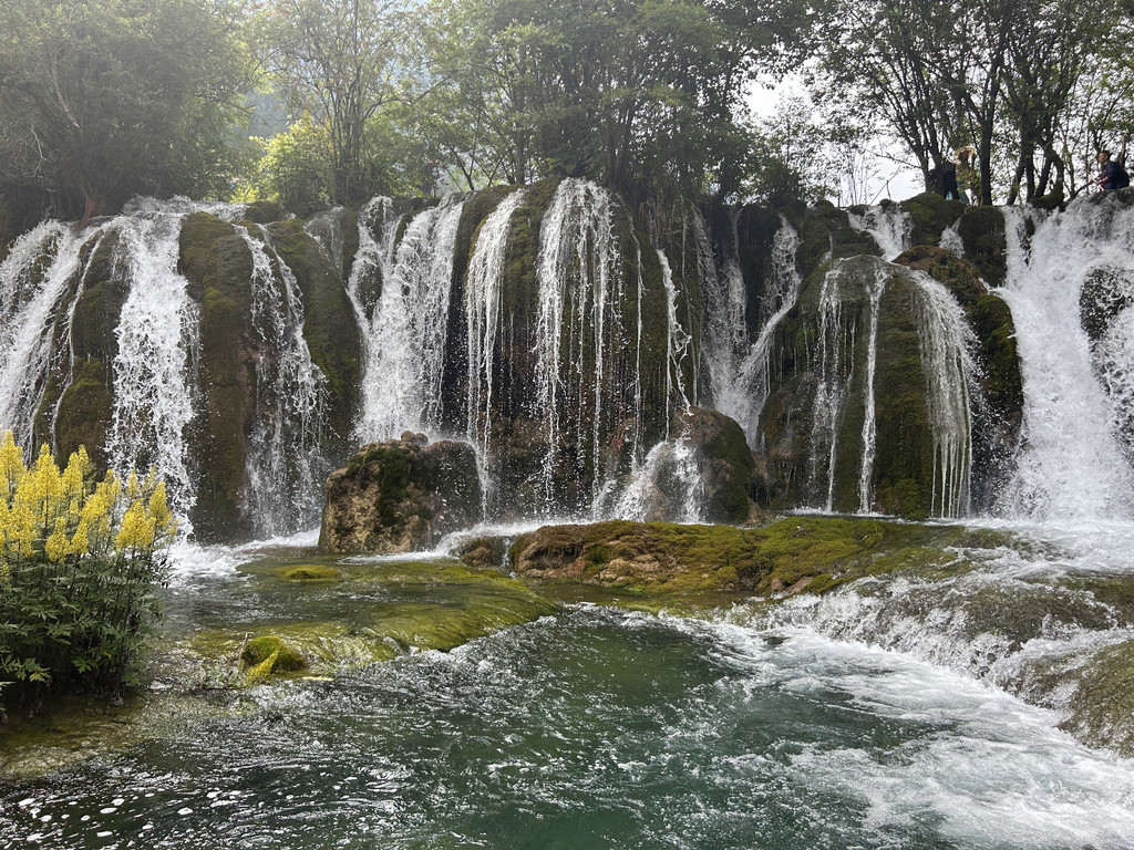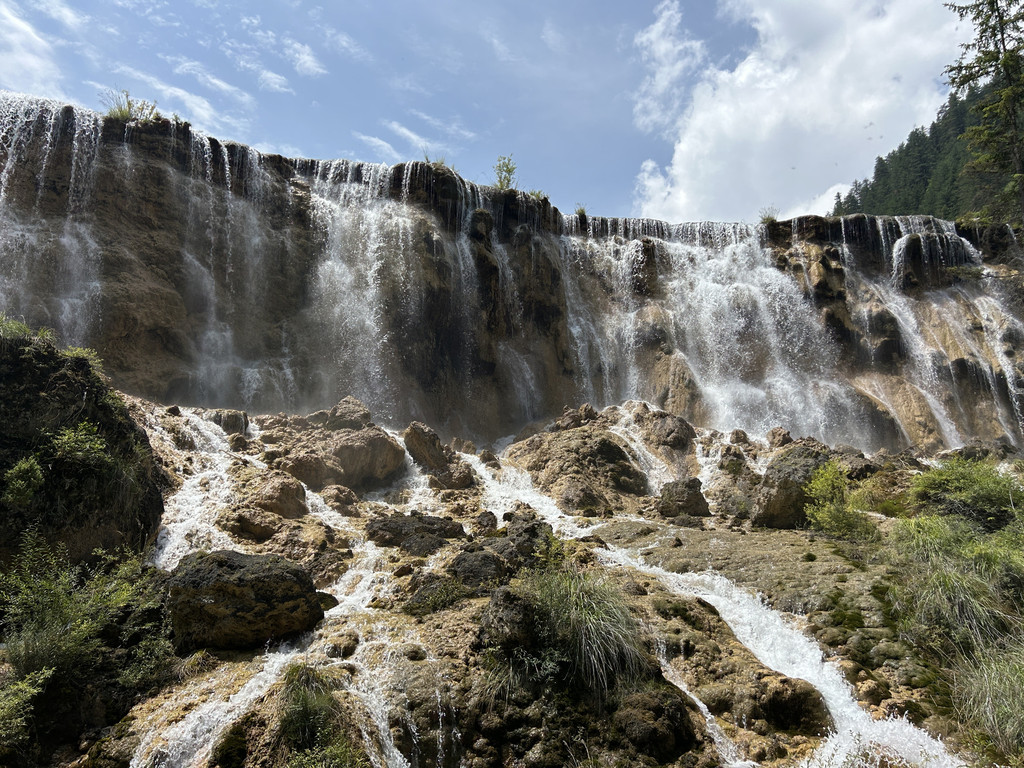 九寨沟的水动到极致的是珍珠滩了。它在五花海与镜海之间,一片世所罕见的钙华滩流。当我置身在这一片滩流之前,真是惊喜莫名。眼前的千折万折流水,千叠万叠急湍,则构成了无穷的自然之美的循环往复。