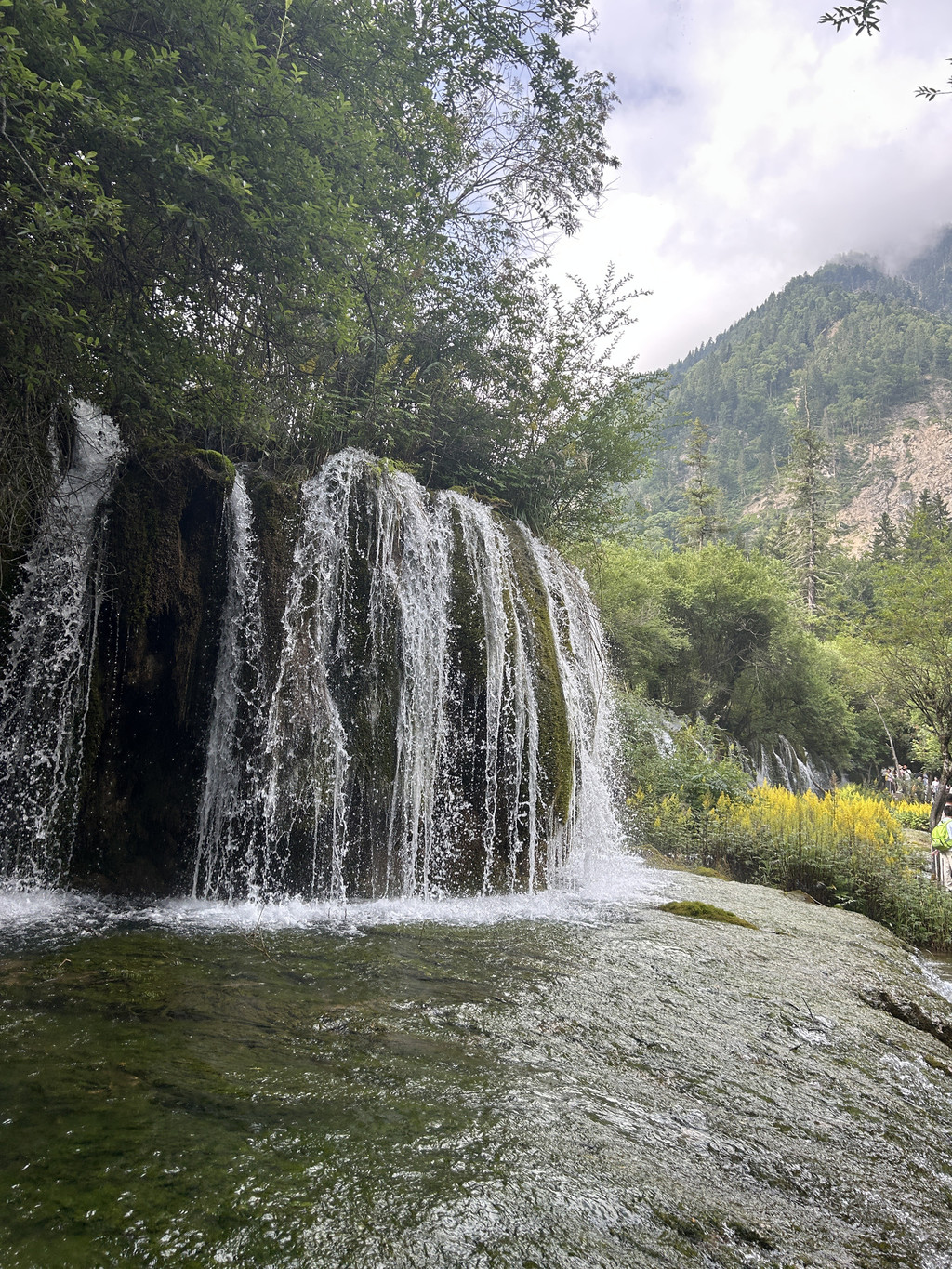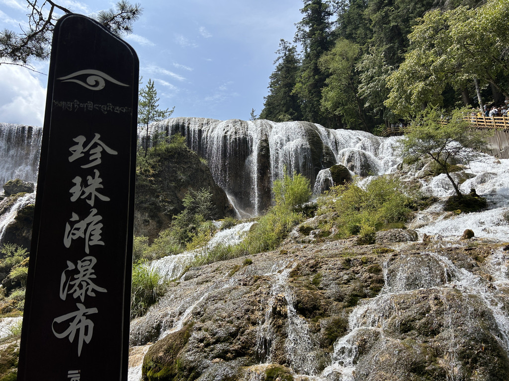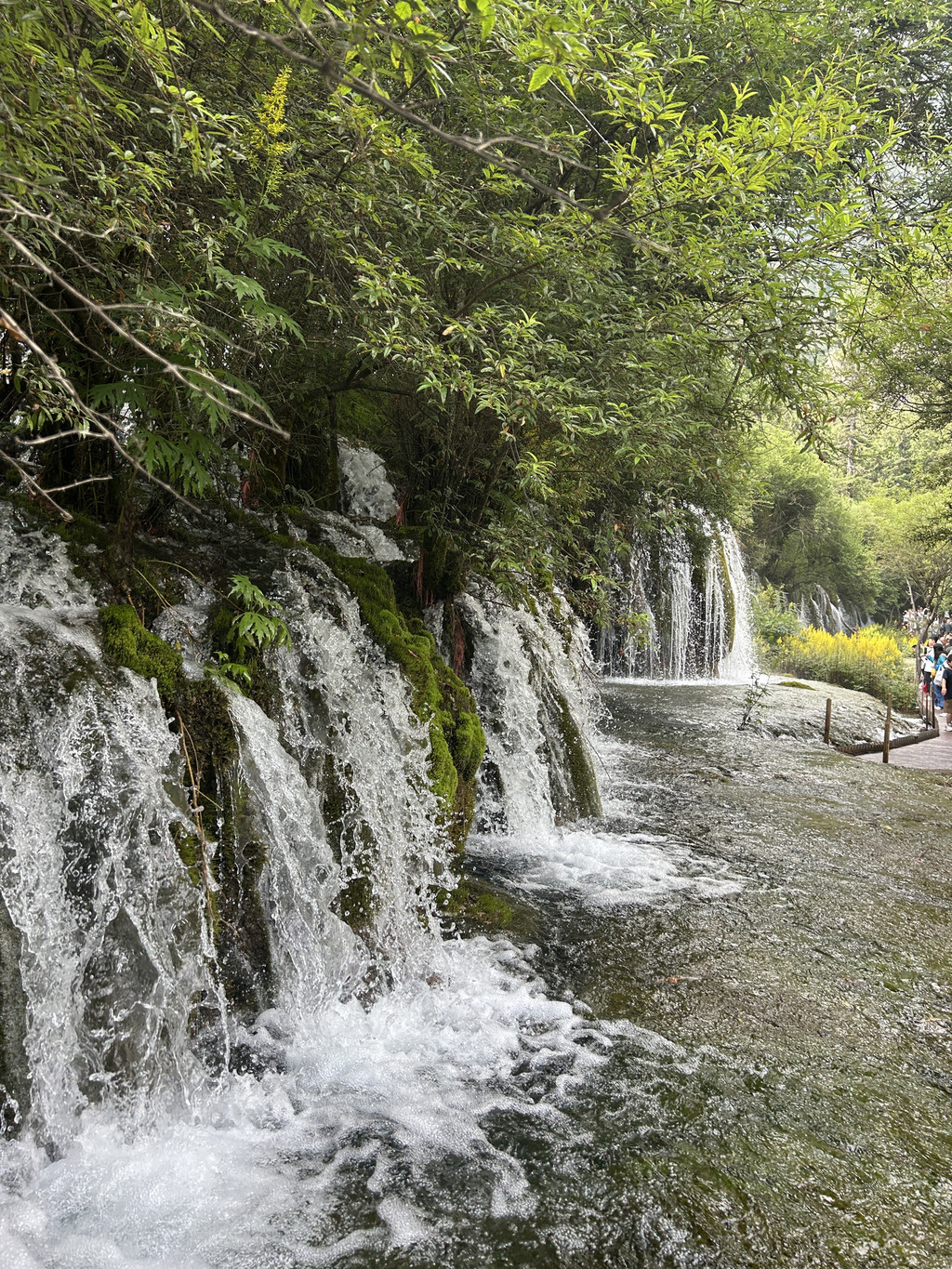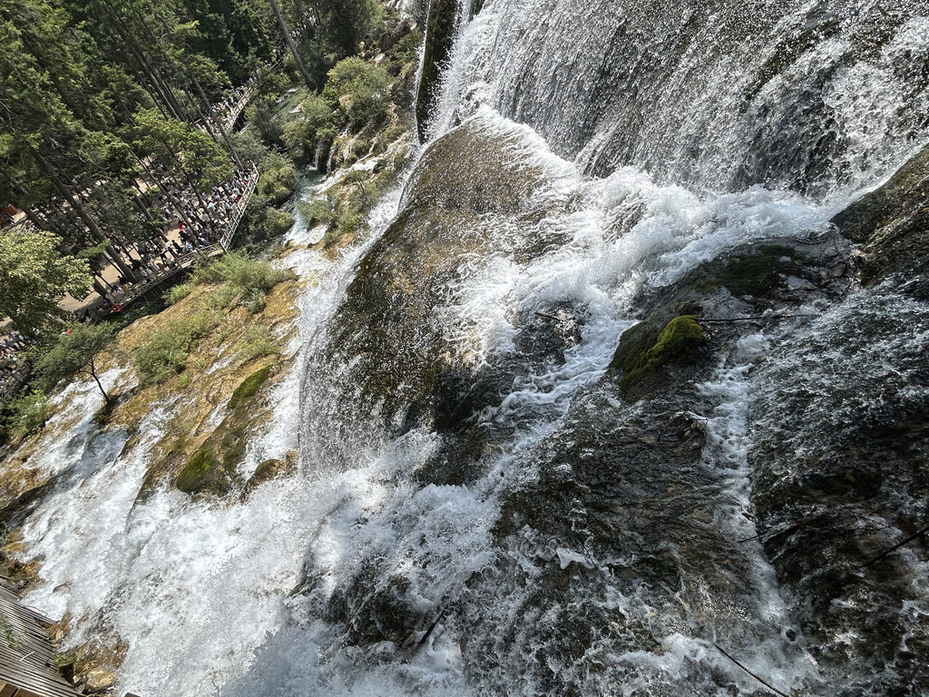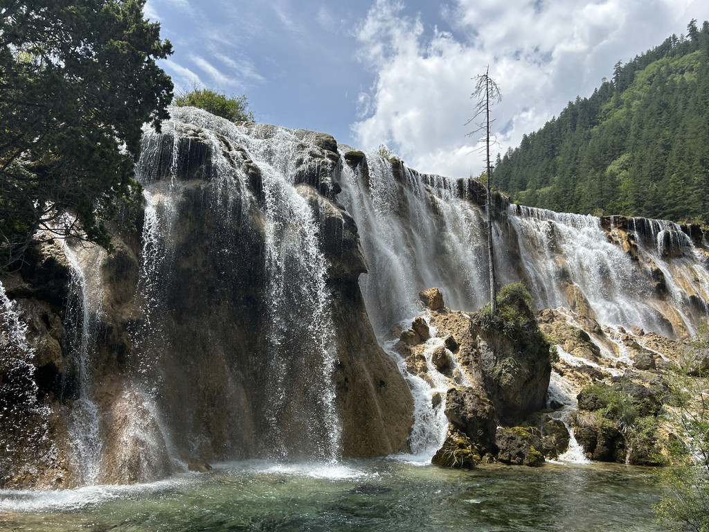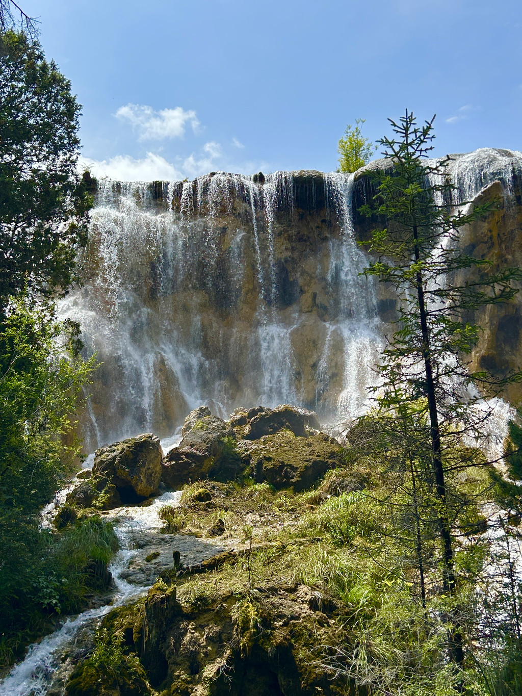 九寨沟的水动到极致的是珍珠滩了。它在五花海与镜海之间,一片世所罕见的钙华滩流。当我置身在这一片滩流之前,真是惊喜莫名。眼前的千折万折流水,千叠万叠急湍,则构成了无穷的自然之美的循环往复。