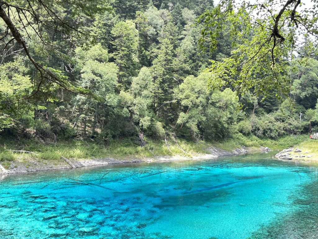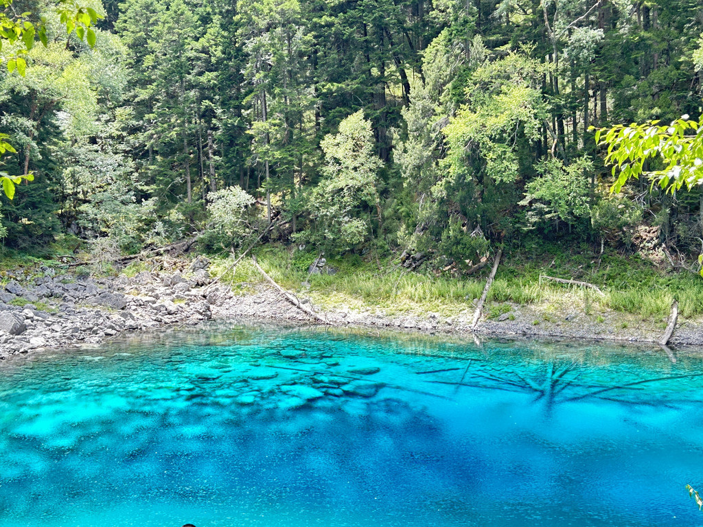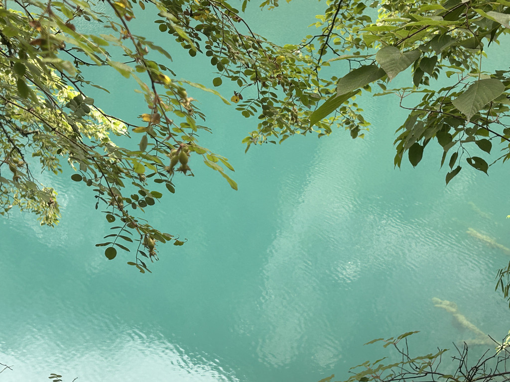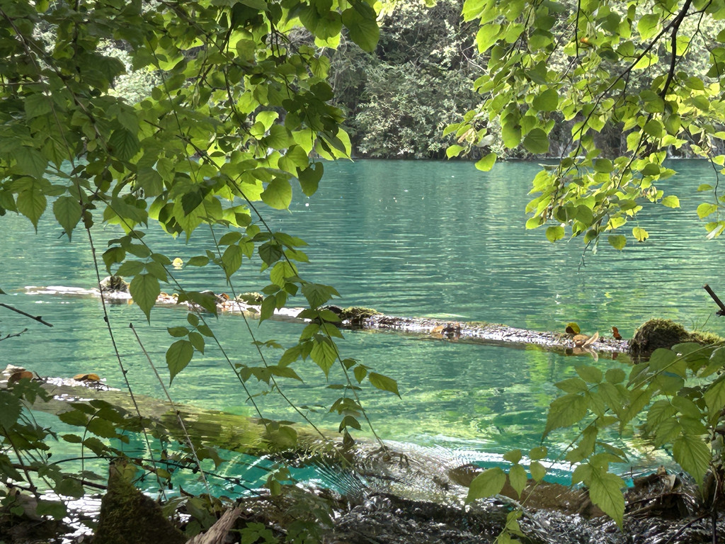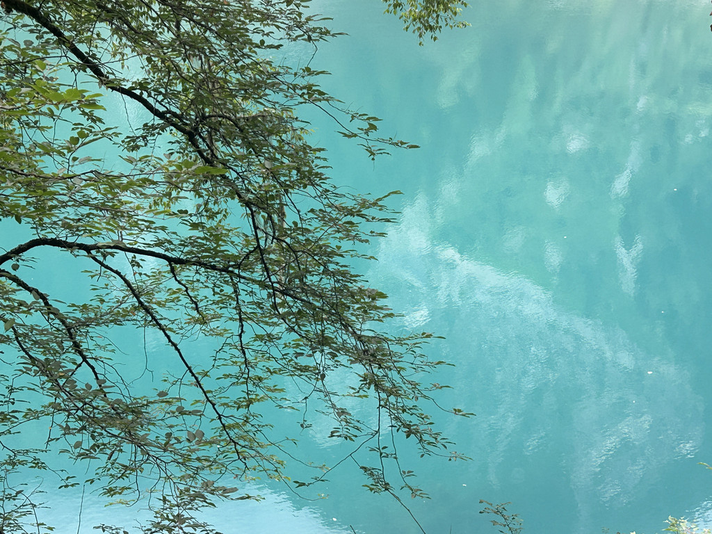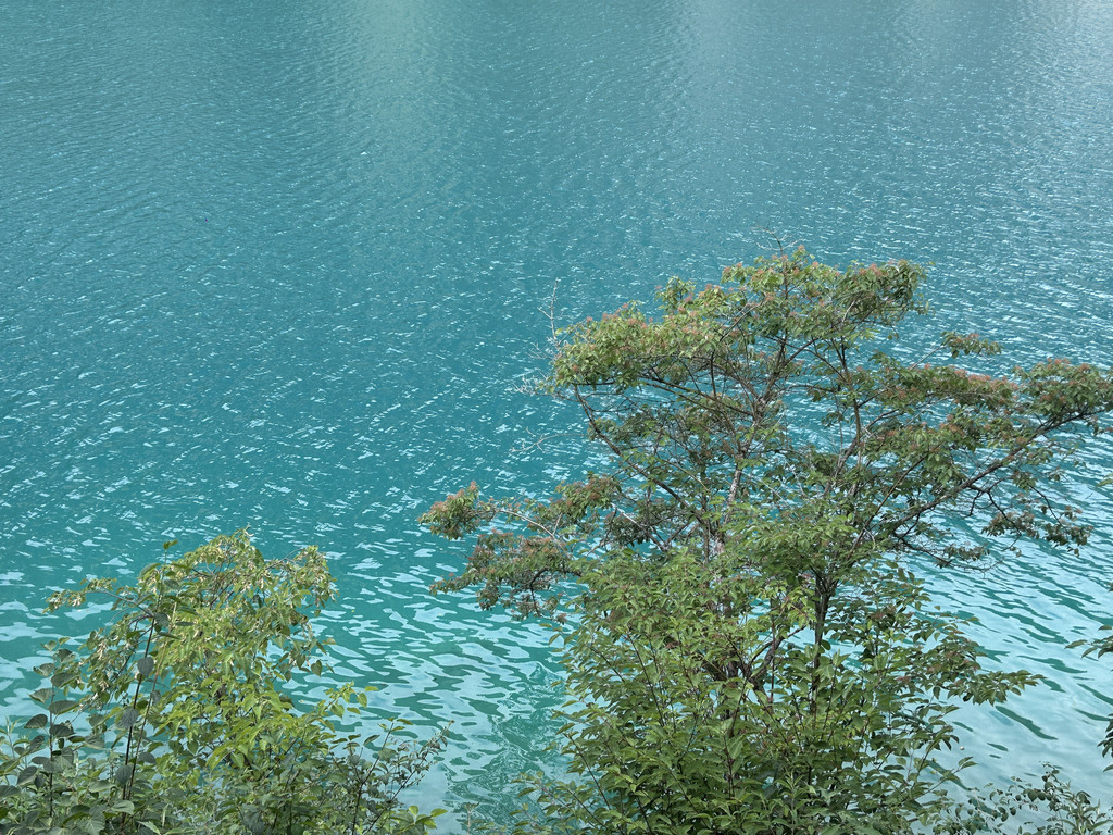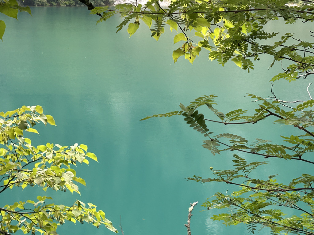 在木板栈道上细看,四周山色树木,无一遗漏地倒映其中,水非常的冰凉、清澈,而且都是呈现绿蓝色的,近岸处是透明的浅绿,渐次加深为翡翠色、蓝绿色,至湖心则成了深不可测的湛蓝。水面上偶尔有落叶飘下,打着旋儿,慢慢沉向水底那些钙化的枯树。这些树已经躺了数十年,甚至上百年,依然保持着沉没时的姿态,不腐不烂,成了水底的一座雕塑园。