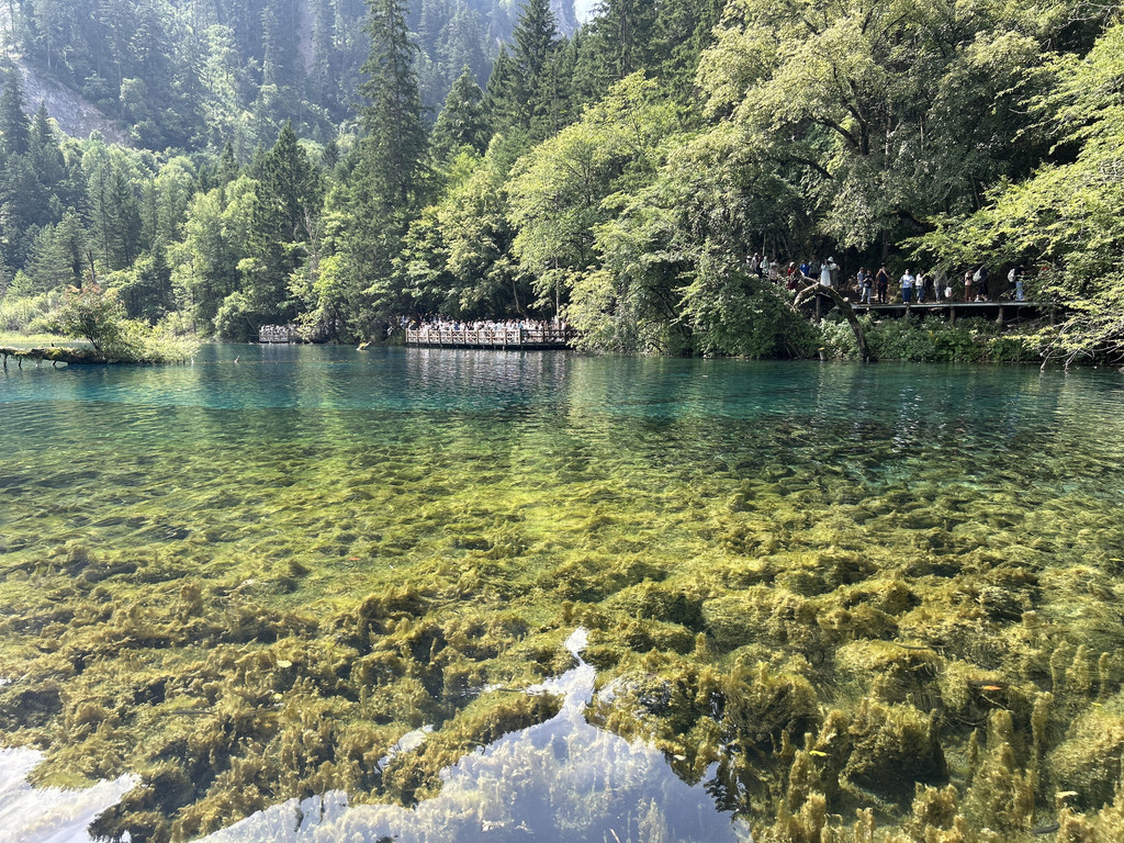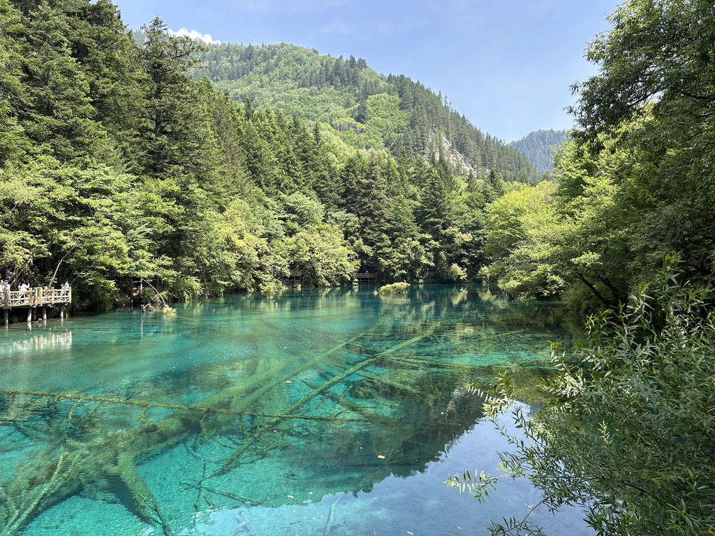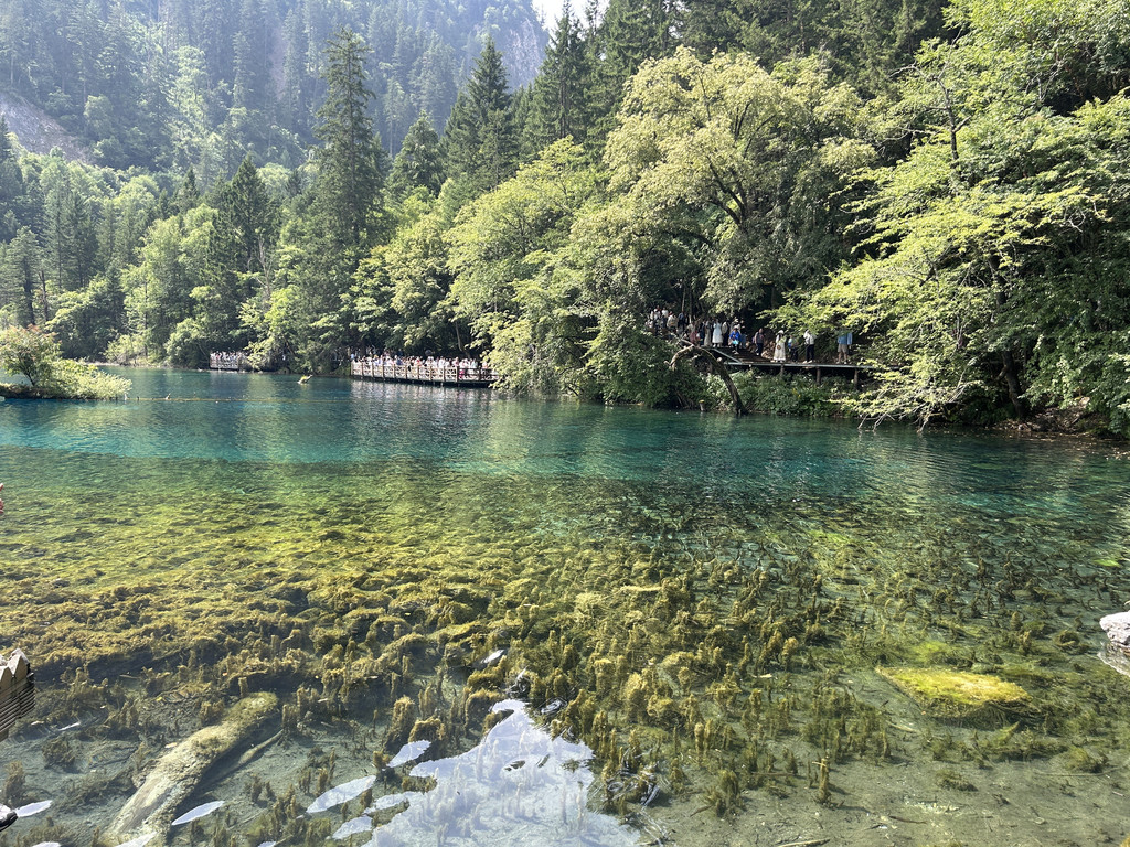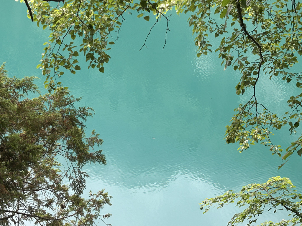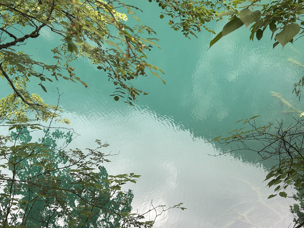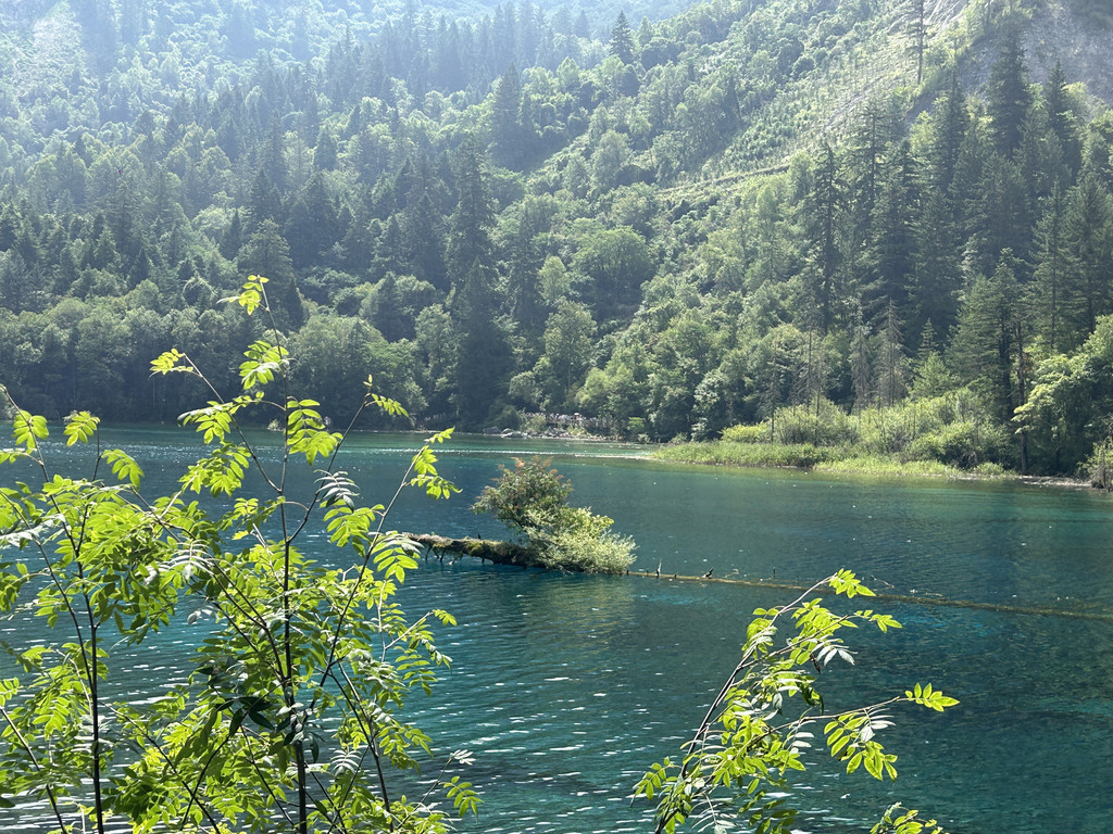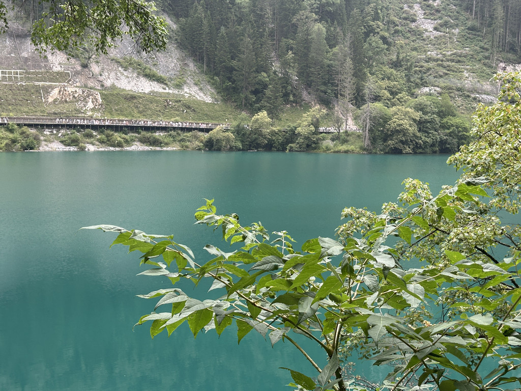在木板栈道上细看,四周山色树木,无一遗漏地倒映其中,水非常的冰凉、清澈,而且都是呈现绿蓝色的,近岸处是透明的浅绿,渐次加深为翡翠色、蓝绿色,至湖心则成了深不可测的湛蓝。水面上偶尔有落叶飘下,打着旋儿,慢慢沉向水底那些钙化的枯树。这些树已经躺了数十年,甚至上百年,依然保持着沉没时的姿态,不腐不烂,成了水底的一座雕塑园。