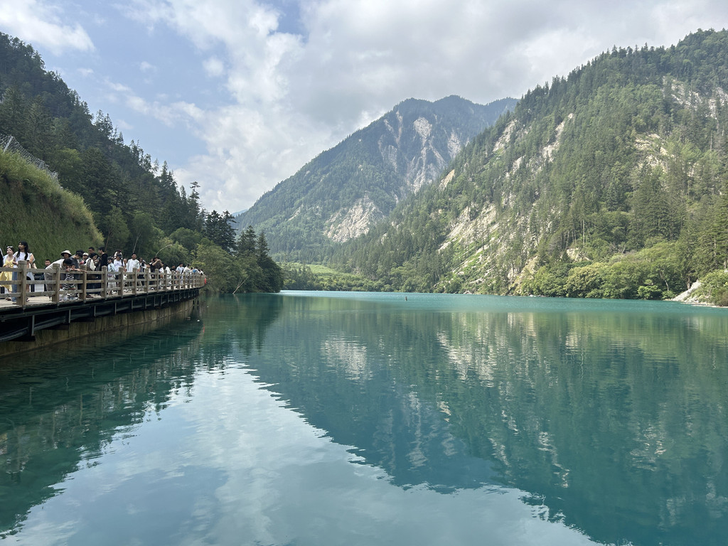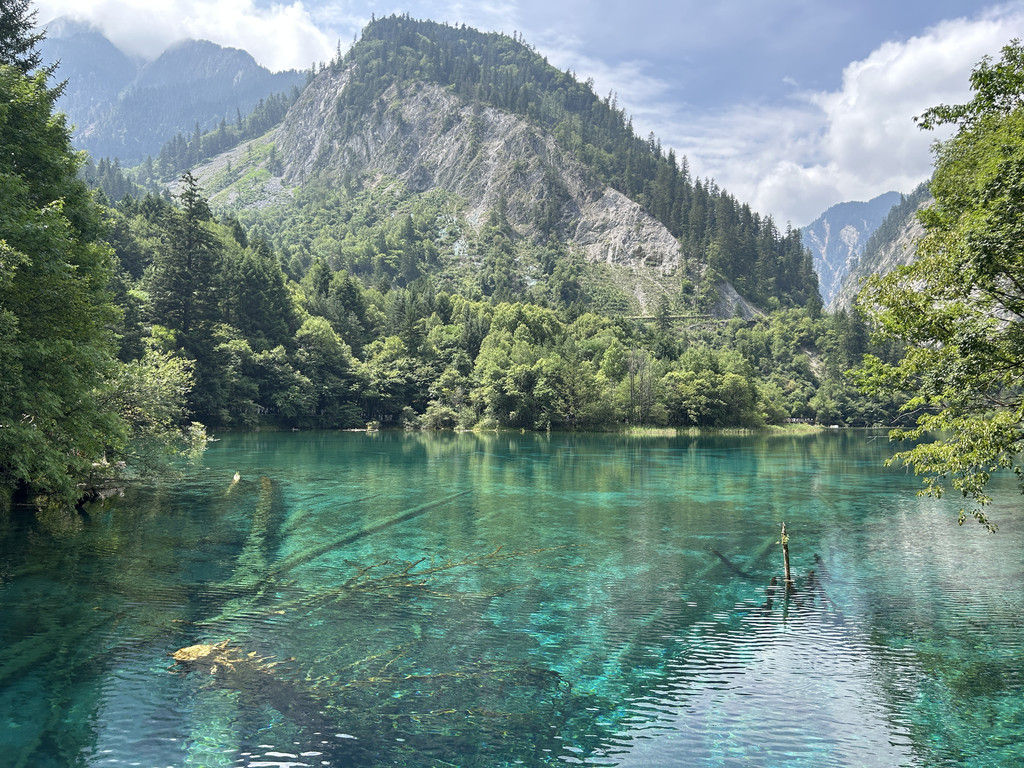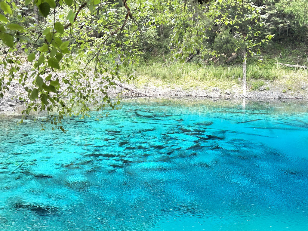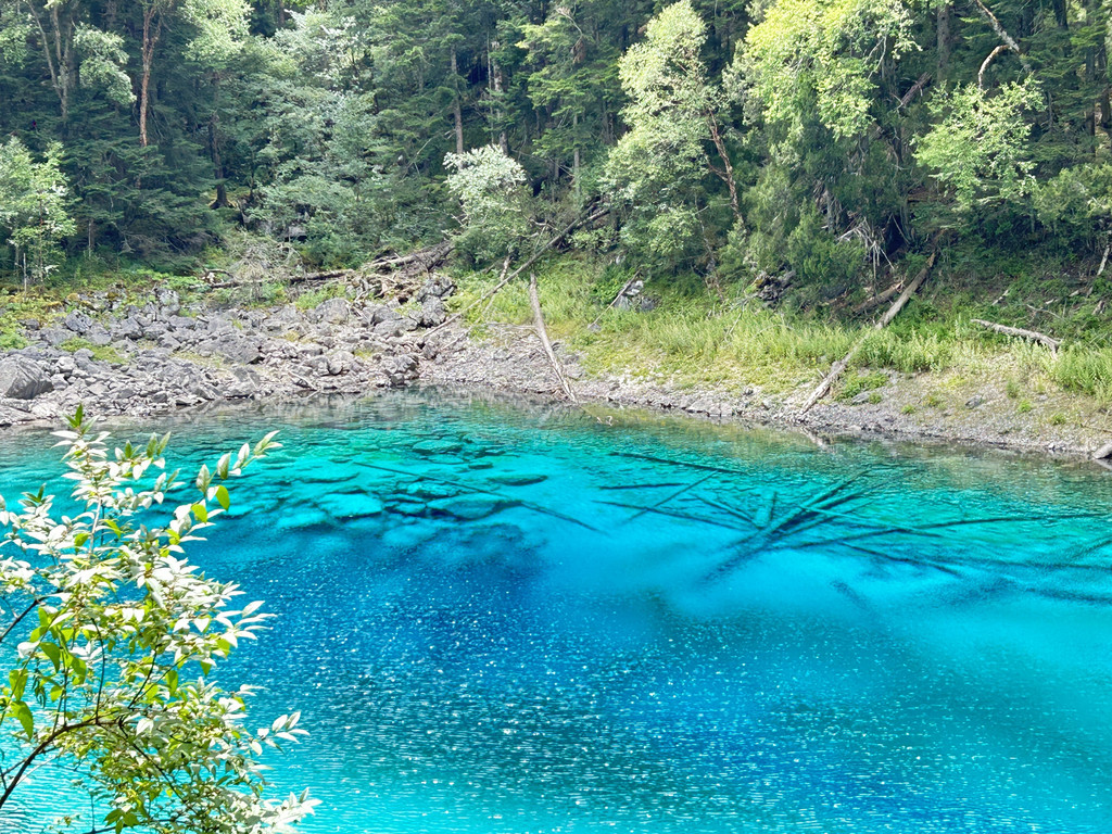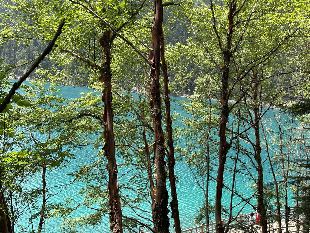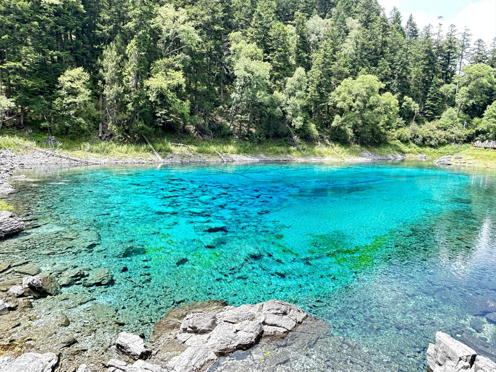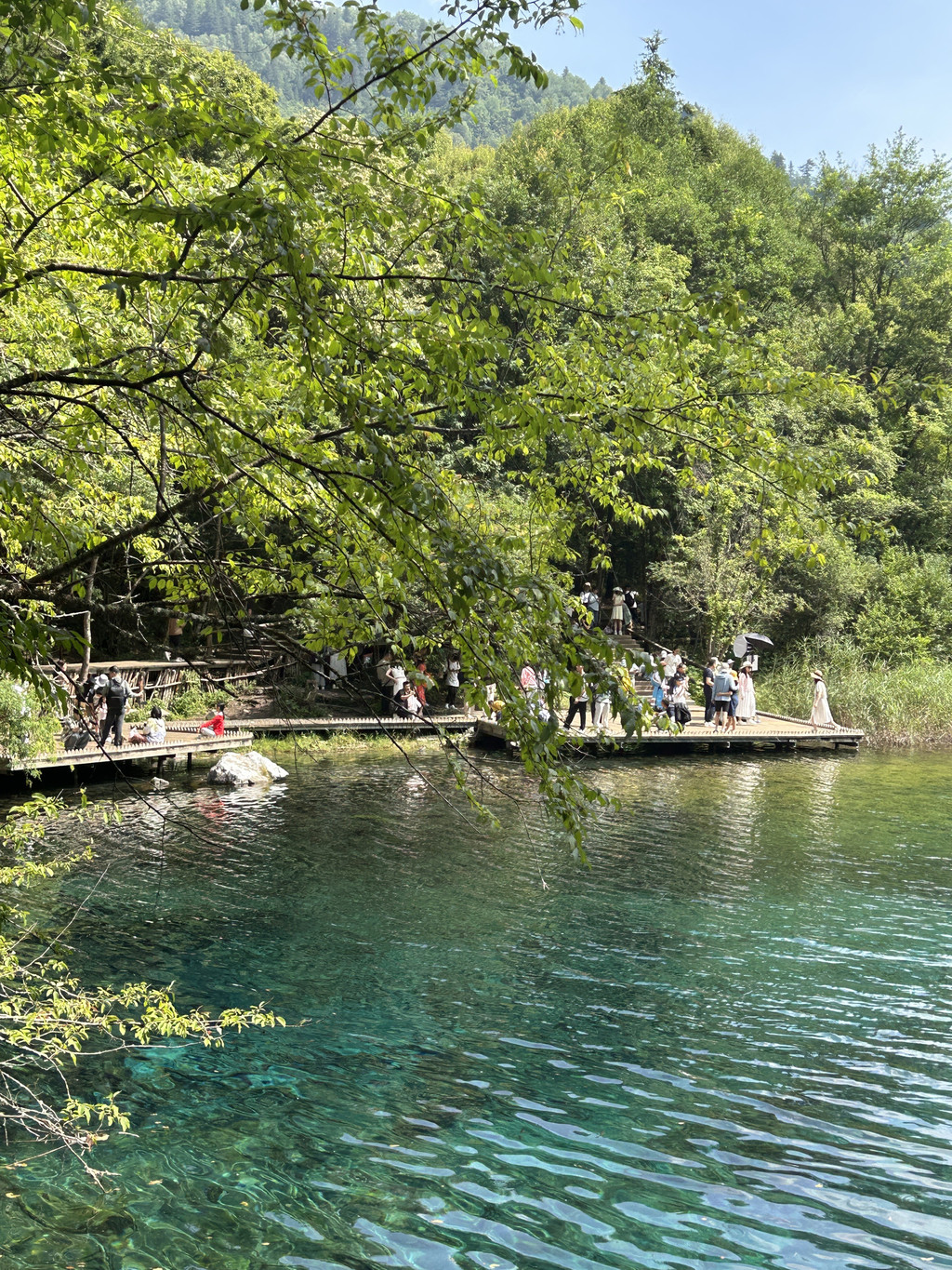 在木板栈道上细看,四周山色树木,无一遗漏地倒映其中,水非常的冰凉、清澈,而且都是呈现绿蓝色的,近岸处是透明的浅绿,渐次加深为翡翠色、蓝绿色,至湖心则成了深不可测的湛蓝。水面上偶尔有落叶飘下,打着旋儿,慢慢沉向水底那些钙化的枯树。这些树已经躺了数十年,甚至上百年,依然保持着沉没时的姿态,不腐不烂,成了水底的一座雕塑园。